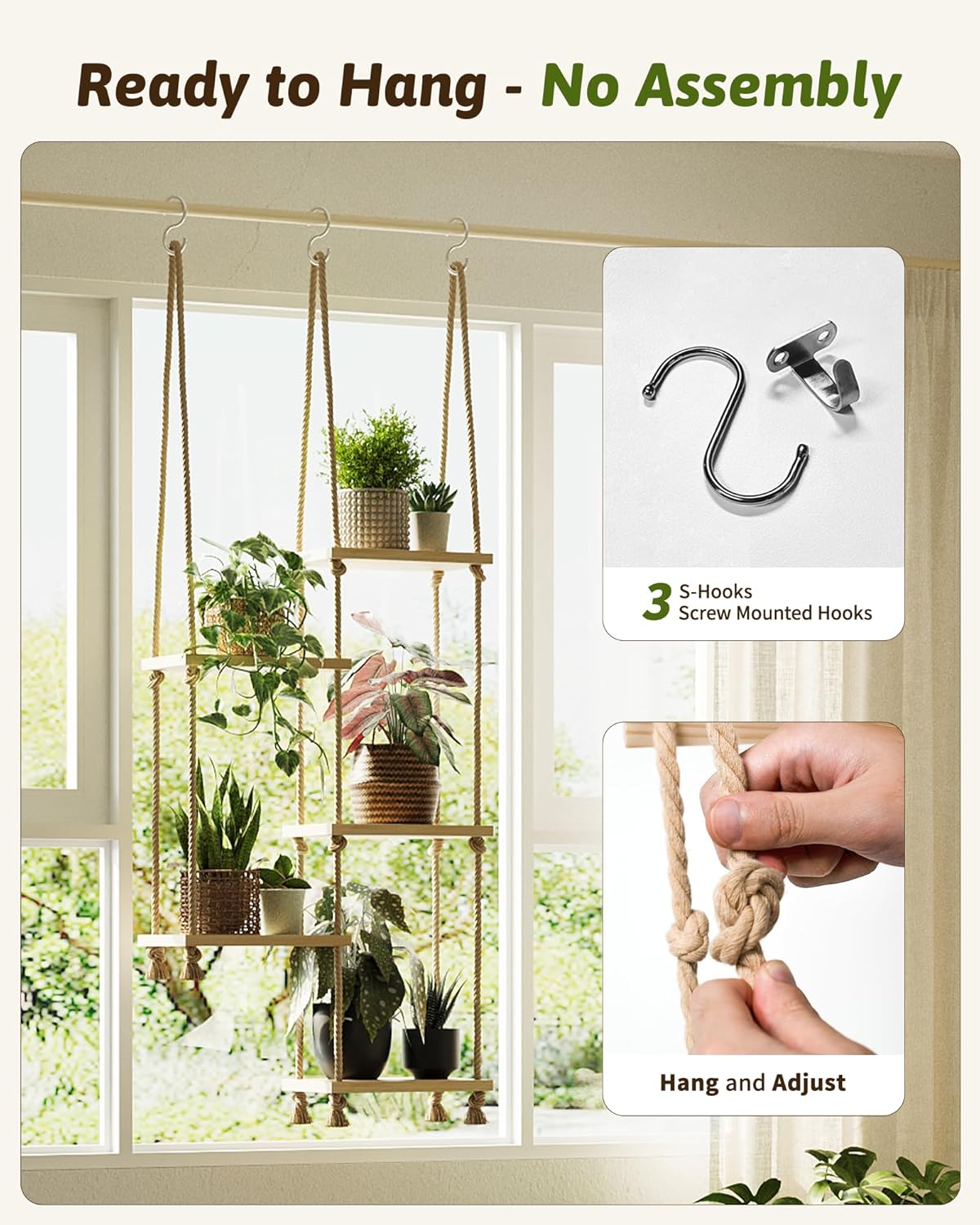 No – Assembly Required: Your plant shelf indoor arrives ready to hang – simply adjust the knots for perfect balance. Comes with 3 S-hooks + 3 adhesive hooks for flexible placement options.