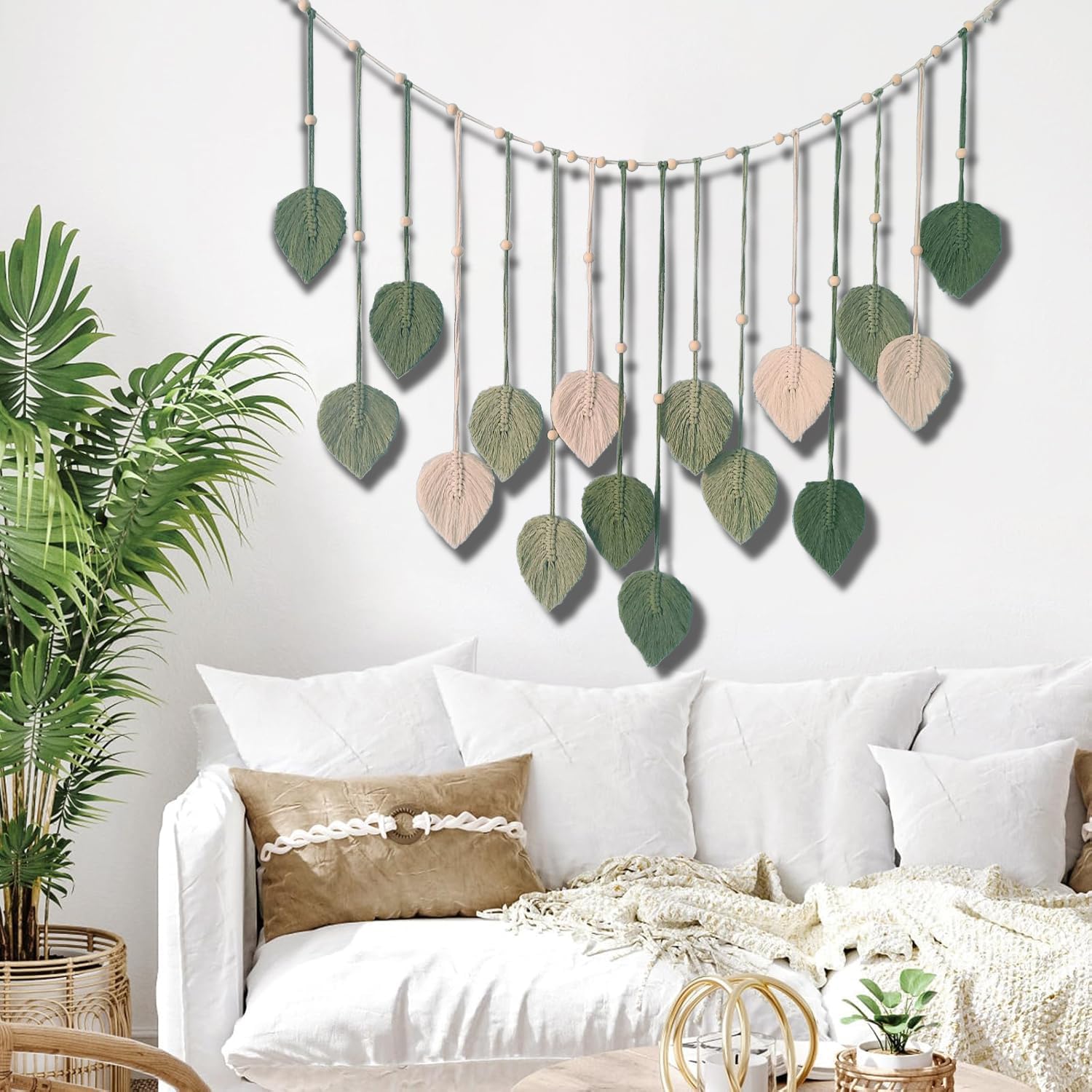 Flexible Hanging & Creative Display (Includes Clips & Nails):10 small clips let you adjust leaf angles or attach photos for a DIY memory wall.Two white nails allow quick,effortless hanging of this macrame wall decor.