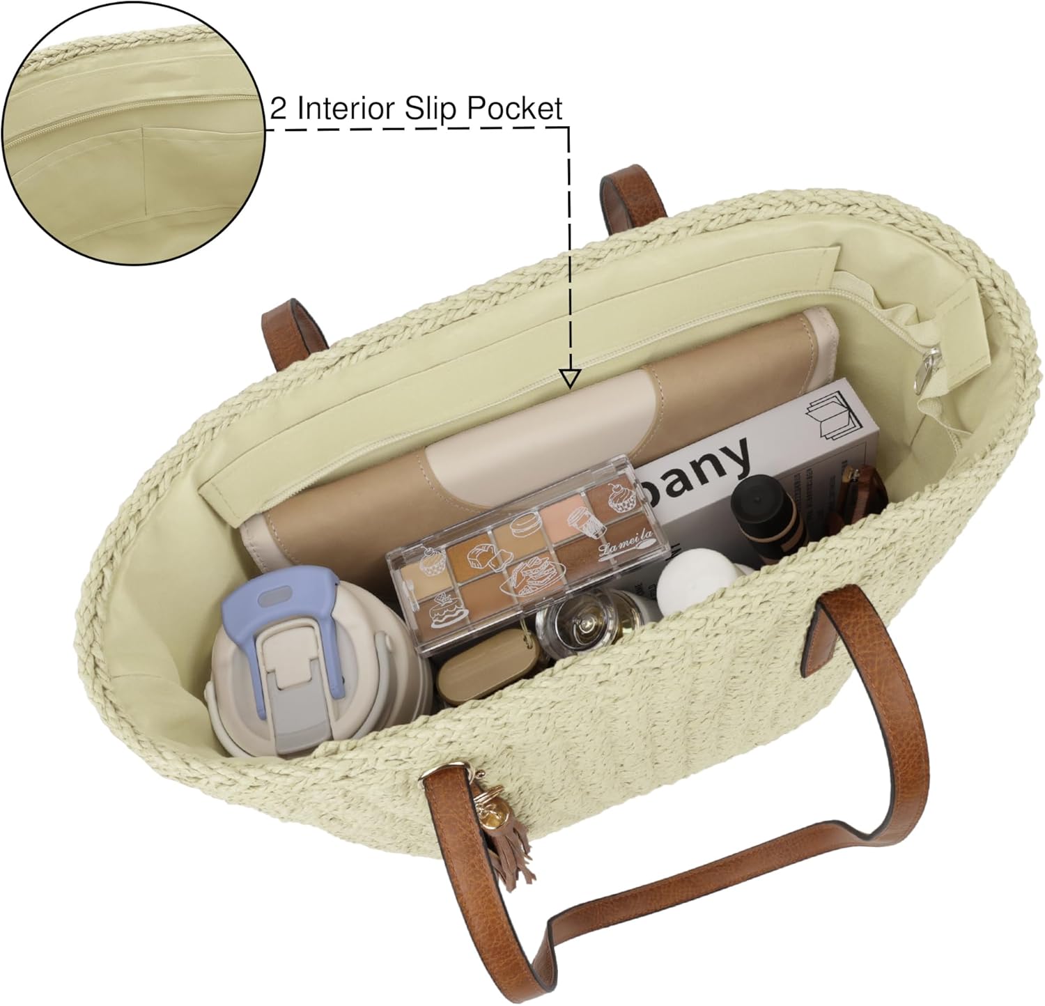 Whether you’re looking for a stylish and functional straw beach bag or a summer handbags, our classic straw tote bag is an excellent choice. Crafted from premium straw and accented with a brown faux leather handles and a fashion tassel charm, this beach woven bag is designed to elevate your summer look while carrying all your essentials. Timeless and versatile, it’s perfect for beach days, travel, vacations, dates, or everyday use.