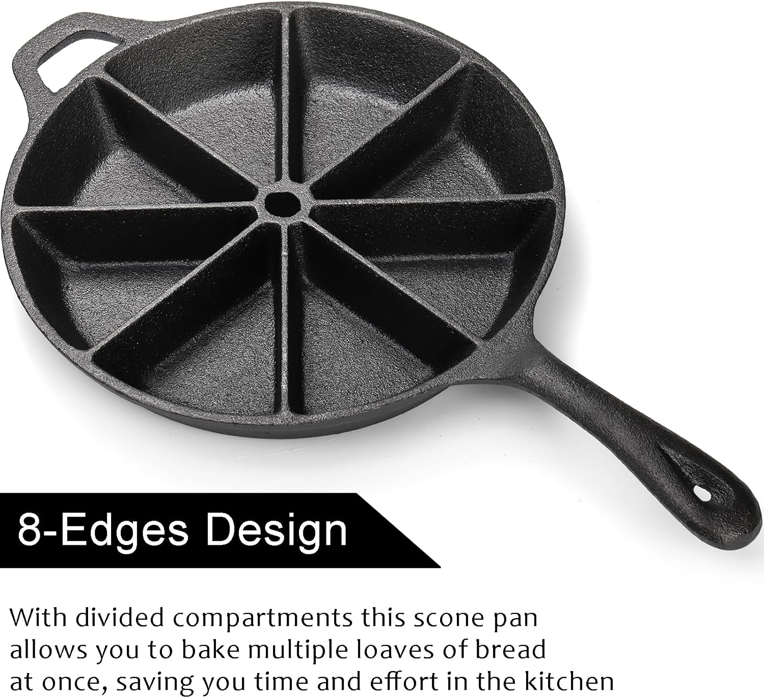 With divided compartments, this scone pan allows you to bake multiple loaves of bread at once, saving you time and effort in the kitchen. Create the most delicious chocolate fudge, cookies, cupcake, apple pie, brownies, muffins, and scones using this pre-seasoned cast iron baking pan.