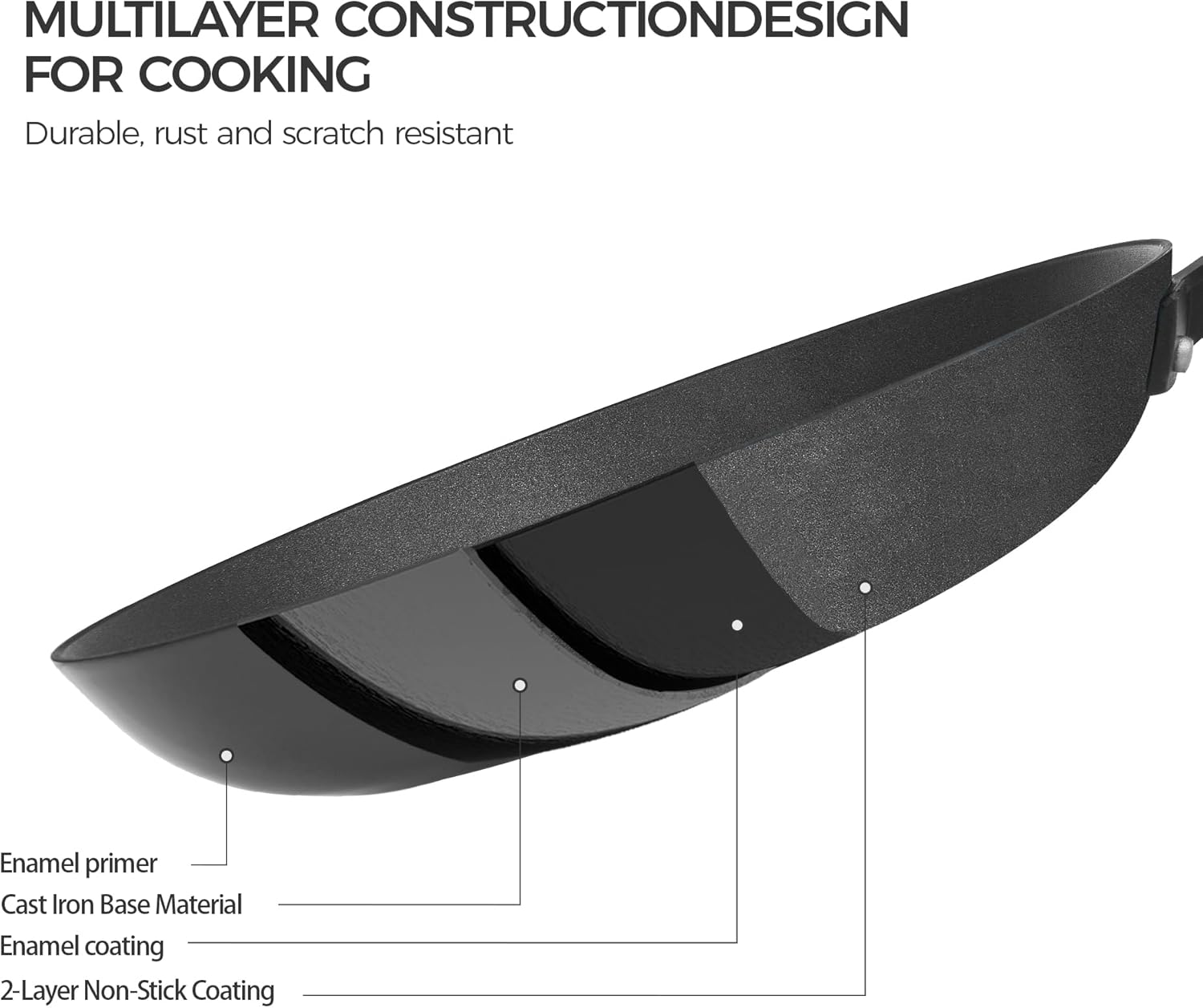 Versatile Cooking & Easy Maintenance:This skillet is perfect for frying, sautéing, baking (up to 500°F), and grilling, making it ideal for various cooking techniques. Its pre-seasoned surface and non-stick properties make cleaning effortless, while its long-lasting enamel coating reduces wear and tear. It’s a must-have tool for any kitchen, from beginners to professional chefs.