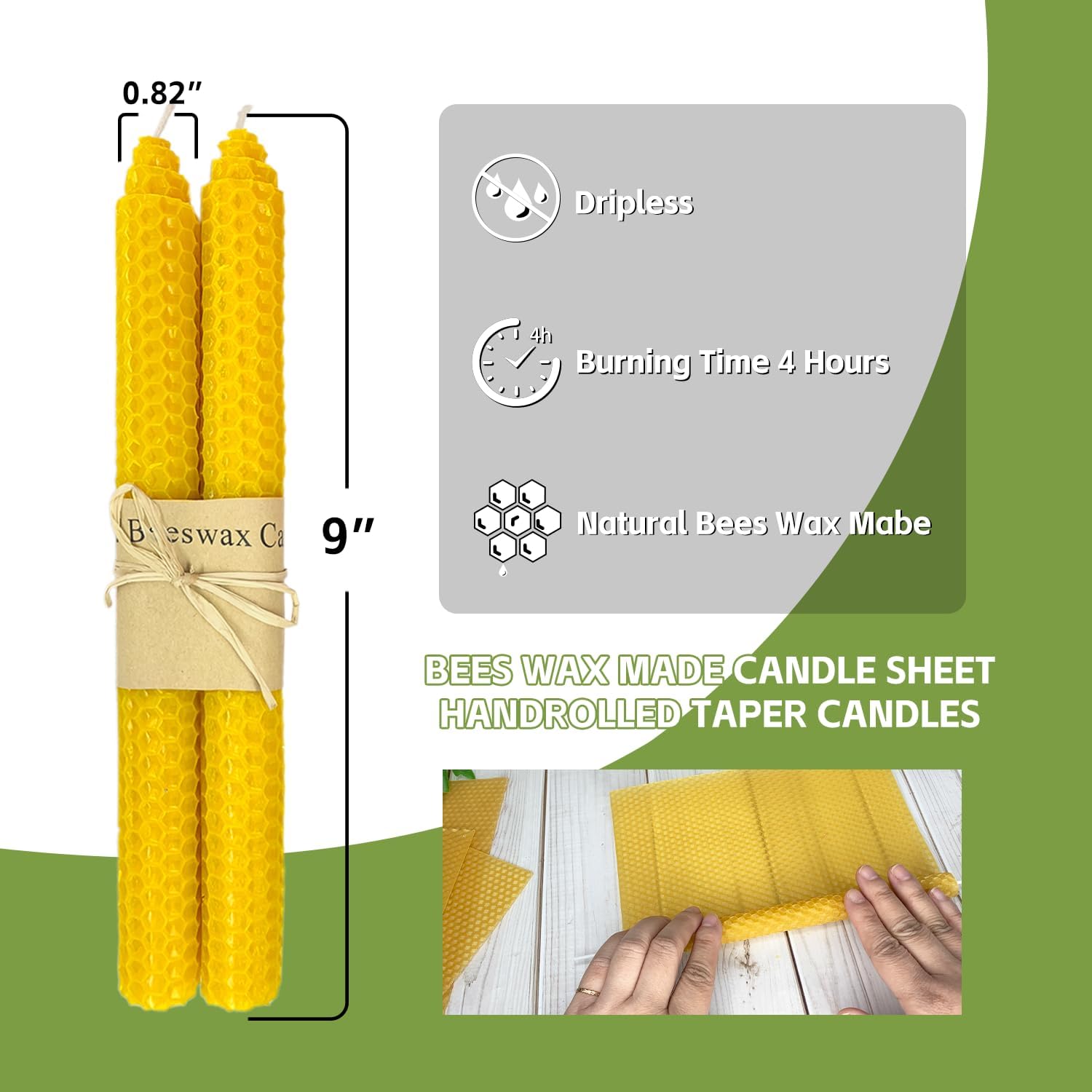 𝐍𝐚𝐭𝐮𝐫𝐚𝐥 𝐁𝐞𝐞𝐬𝐰𝐚𝐱 𝐂𝐚𝐧𝐝𝐥𝐞𝐬𝐭𝐢𝐜𝐤𝐬 | 𝟗” 𝐇𝐚𝐧𝐝-𝐑𝐨𝐥𝐥𝐞𝐝 𝐓𝐚𝐩𝐞𝐫𝐬: Crafted with care using 100% natural beeswax, our candles begin with pure wax poured into authentic beehive-textured molds. Each sheet is meticulously hand-rolled into elegant 9-inch taper candles, preserving the organic charm of raw honeycomb patterns for rustic yet sophisticated decor.