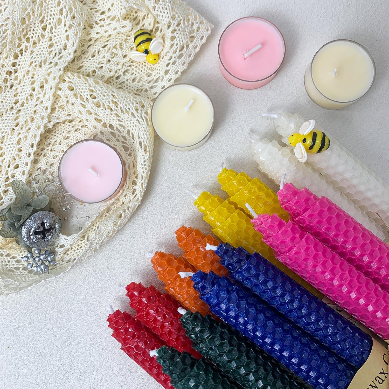 𝐔𝐧𝐢𝐪𝐮𝐞 𝐁𝐞𝐞𝐡𝐢𝐯𝐞 𝐓𝐞𝐱𝐭𝐮𝐫𝐞 | 𝐋𝐢𝐠𝐡𝐭𝐰𝐞𝐢𝐠𝐡𝐭 & 𝐃𝐞𝐜𝐨𝐫𝐚𝐭𝐢𝐯𝐞:Unlike bulky solid beeswax candles, our hand-rolled sheets create lightweight tapers with intricate hive detailing. The delicate texture catches light beautifully, doubling as functional art for wedding centerpieces, holiday tablescapes, or everyday elegance.