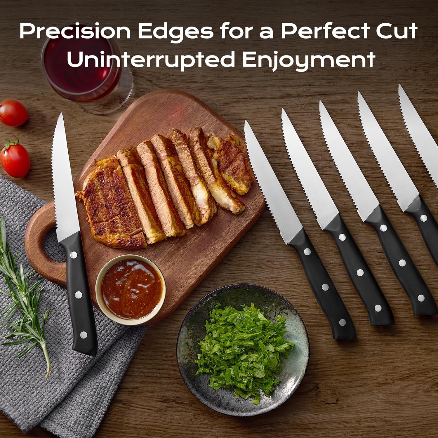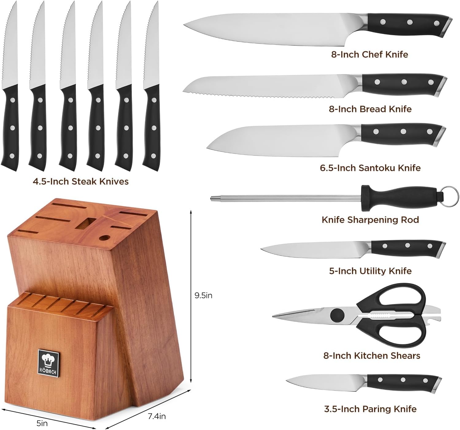【Complete 14-Piece Kitchen Knife Set】 This all-in-one knife set with block includes everything you need: 8″ chef knife, 6.5″ santoku, 8″ bread knife, 5″ utility knife, 3.5″ paring knife, 6 steak knives set of 6, kitchen shears, sharpening rod, and a sturdy oak wood knife block. Perfect for home cooks and professionals alike.