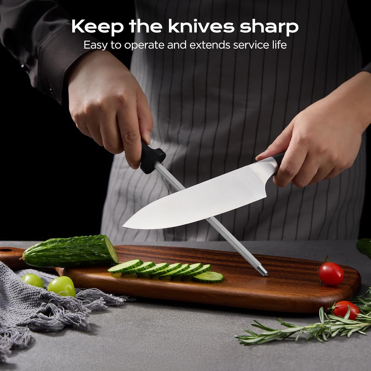 【Easy Maintenance & Sharpness Retention】 The included sharpening rod keeps your knives razor-sharp for precise cuts every time. With proper care, this knife set will remain a reliable kitchen essential for years to come. Hand wash recommended for best results.