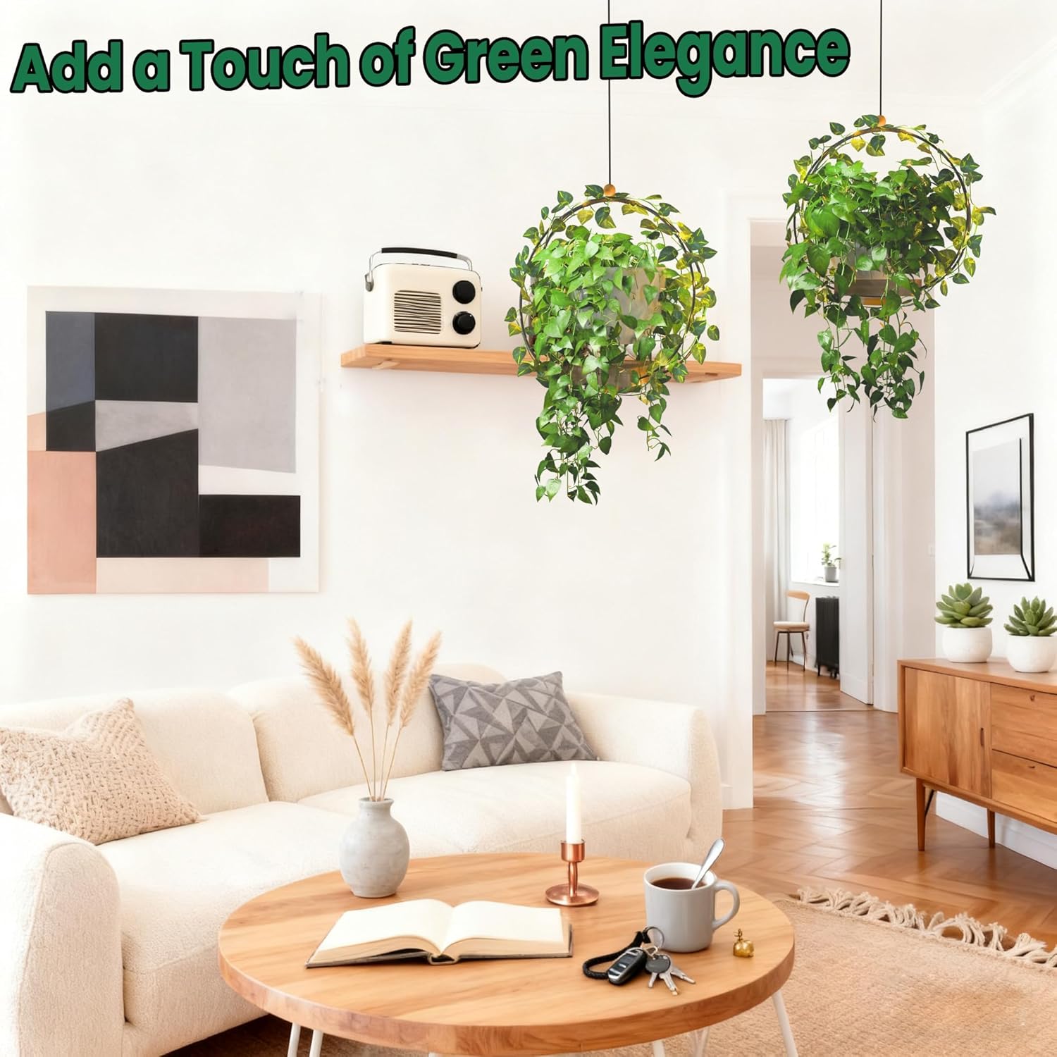 2 PACK VALUE SET – A convenient and affordable 2-pack for versatile decorating. Each includes a 24-inch rope, 12-inch ring diameter, 5-inch wood base, and 39.4-inch LED string. Holds up to 15 lbs — adjustable height fits various ceiling levels. (Plants, pots, and AA batteries not included.)