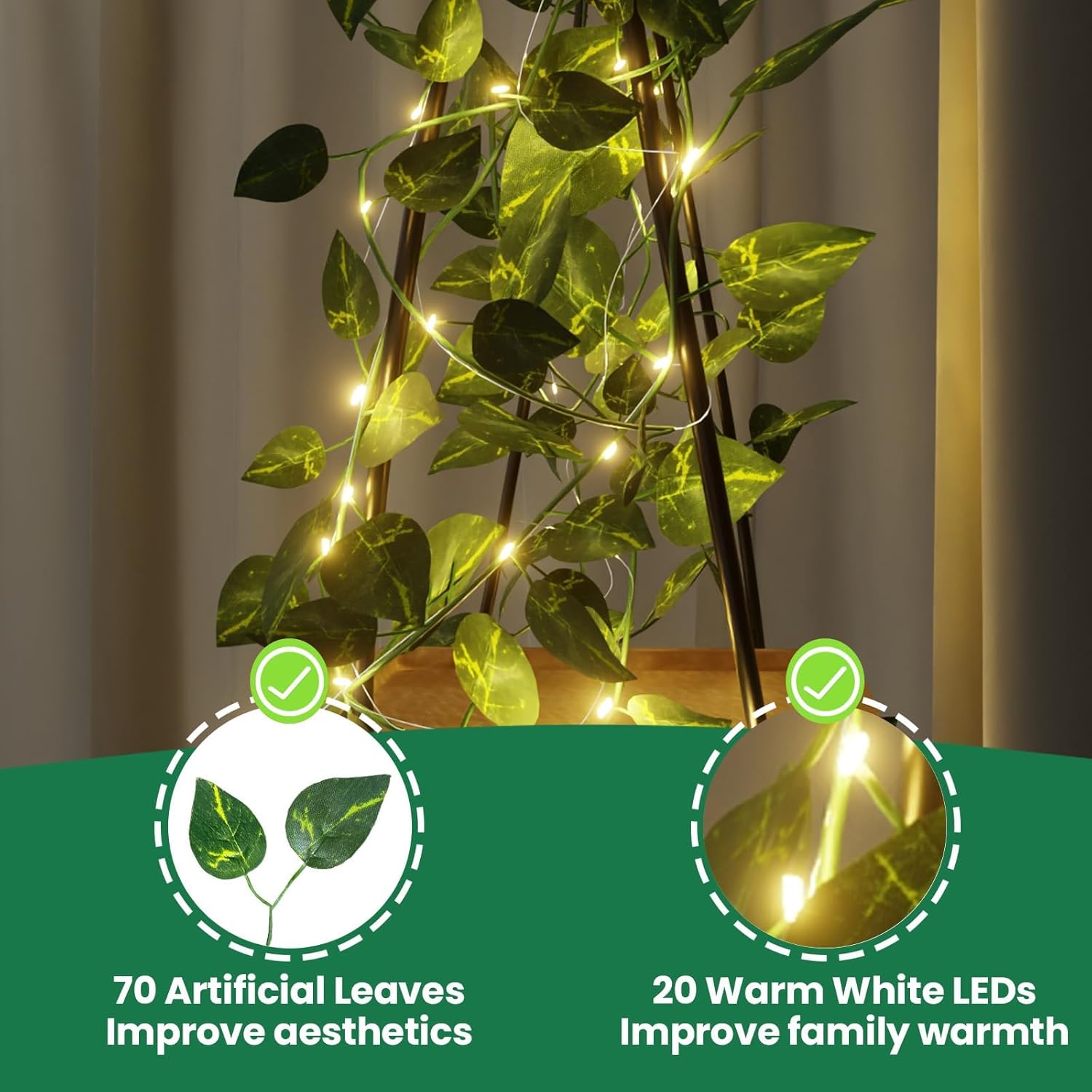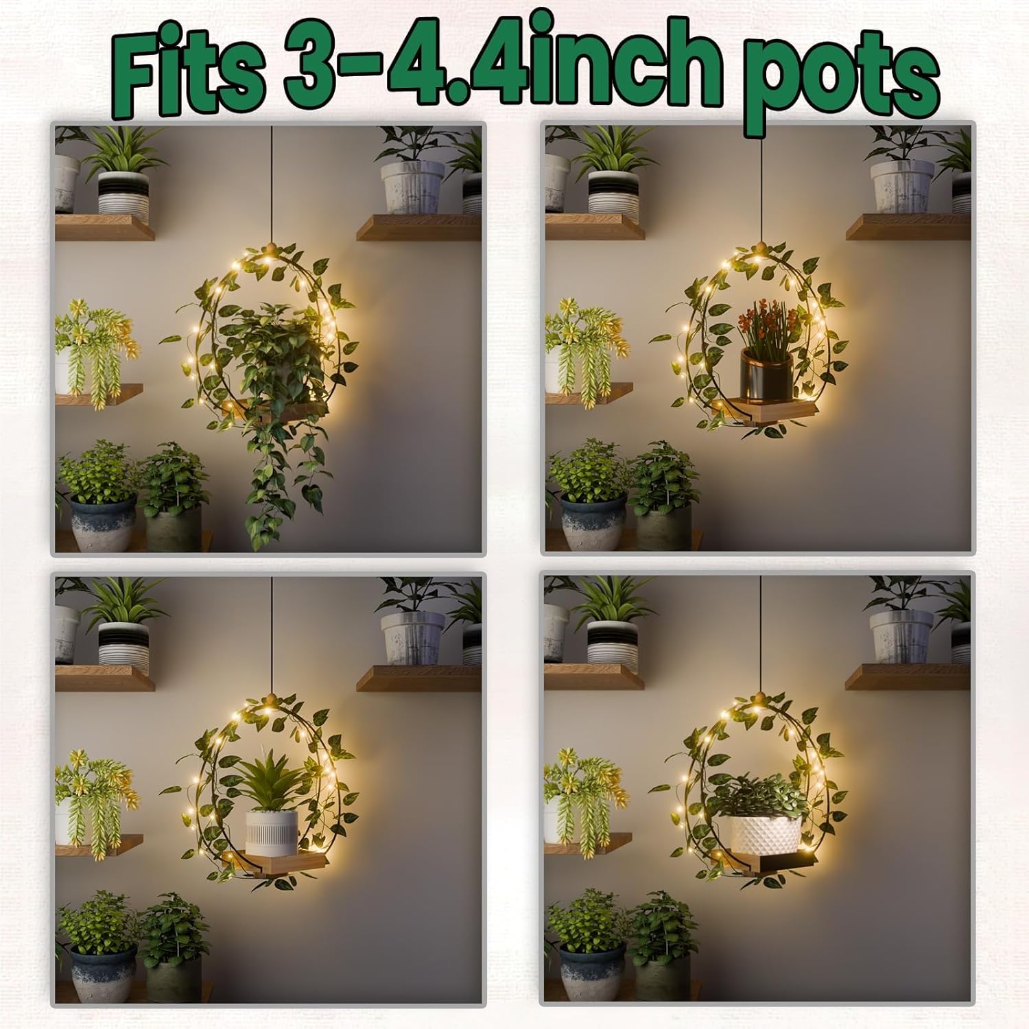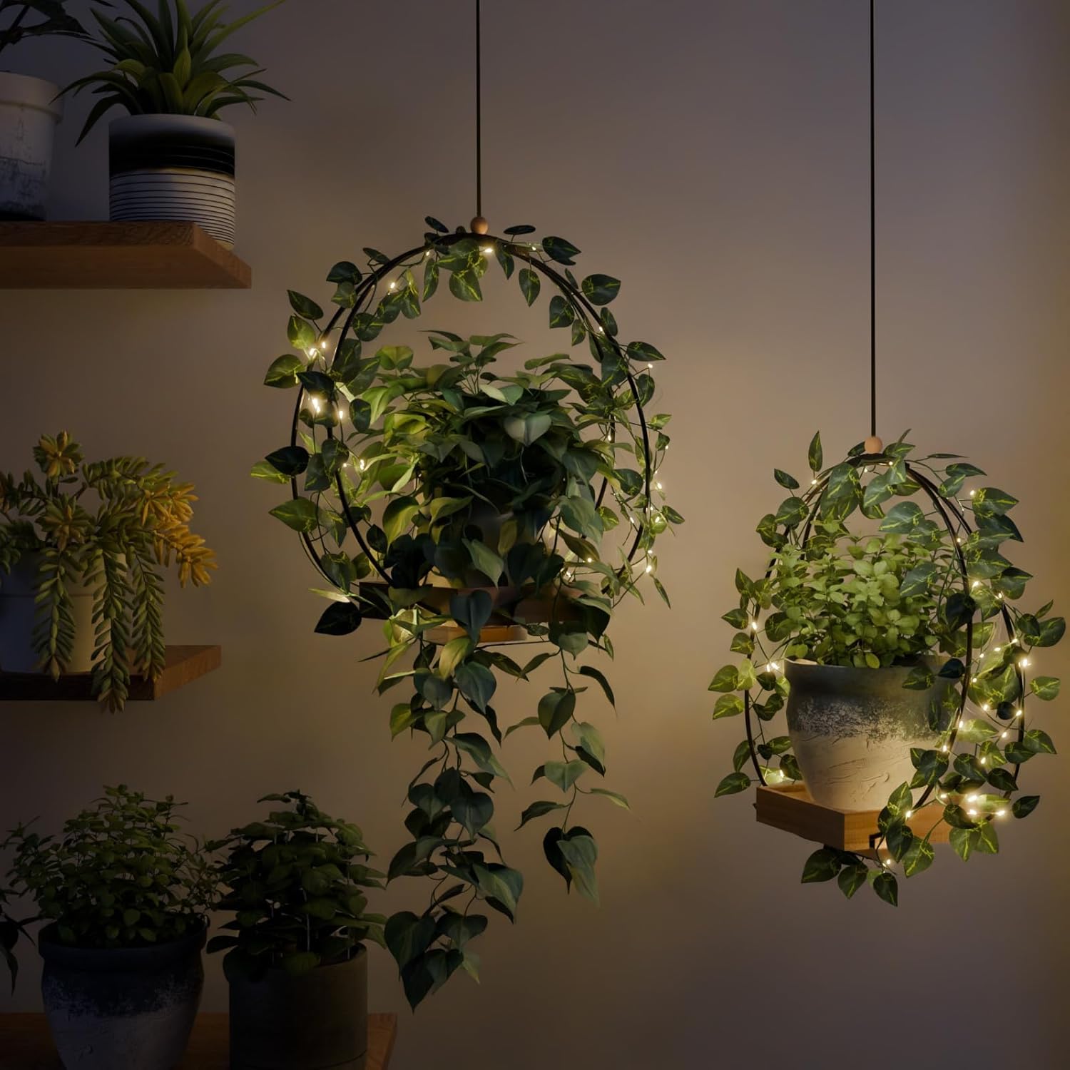 HIGH QUALITY MATERIAL – Crafted with a strong solid wood base, durable metal hangers, and reliable nylon cords, each planter is wrapped with 20 warm LED lights and 70 lifelike artificial leaves. Designed to create a lasting, natural touch that brightens your home day and night.