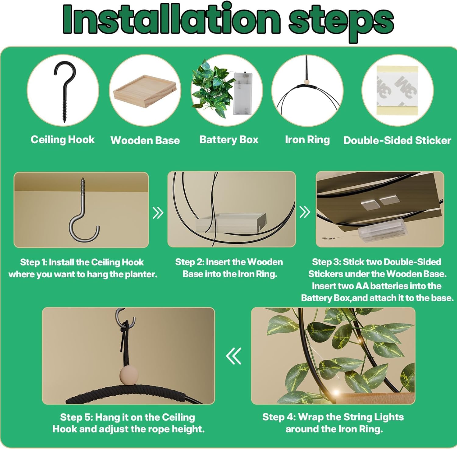 2 PACK VALUE SET – A convenient and affordable 2-pack for versatile decorating. Each includes a 24-inch rope, 12-inch ring diameter, 5-inch wood base, and 39.4-inch LED string. Holds up to 15 lbs — adjustable height fits various ceiling levels. (Plants, pots, and AA batteries not included.)