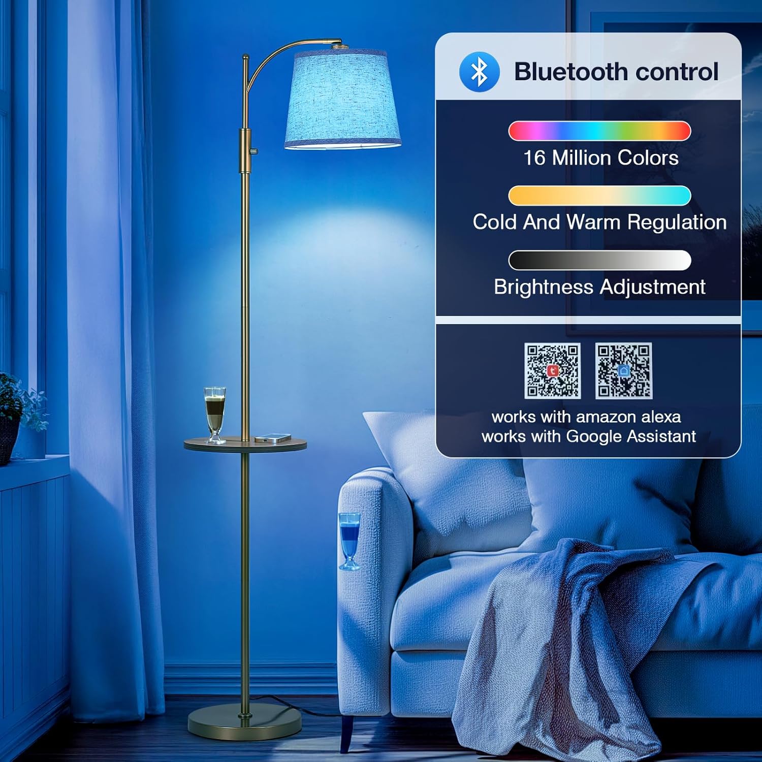 2-in-1 Space-Saving Design:This modern arc floor lamp combines lighting + storage in one sleek unit. The built-in side table holds drinks, books, or remotes—perfect for small spaces like apartments, living rooms, or bedrooms. Maximize your space without sacrificing style!Smooth Dimming & 16M RGB Colors:Customize your vibe: Adjust brightness from warm nightlight to task lighting, or pick from 16 million colors via the app. Set the mood for movie nights, parties, or cozy reading—all with a tap on your phone.Smart Voice Control & App:”Alexa, dim the lights!” Hands-free control works with Alexa & Google Assistant. Scan the QR code to pair the app, then adjust settings from your couch. No more fumbling for switches!Built Tough, Saves Energy:Sturdy metal frame + weighted base won’t tip. The LED bulb lasts years and cuts energy costs—bright light without the guilt.