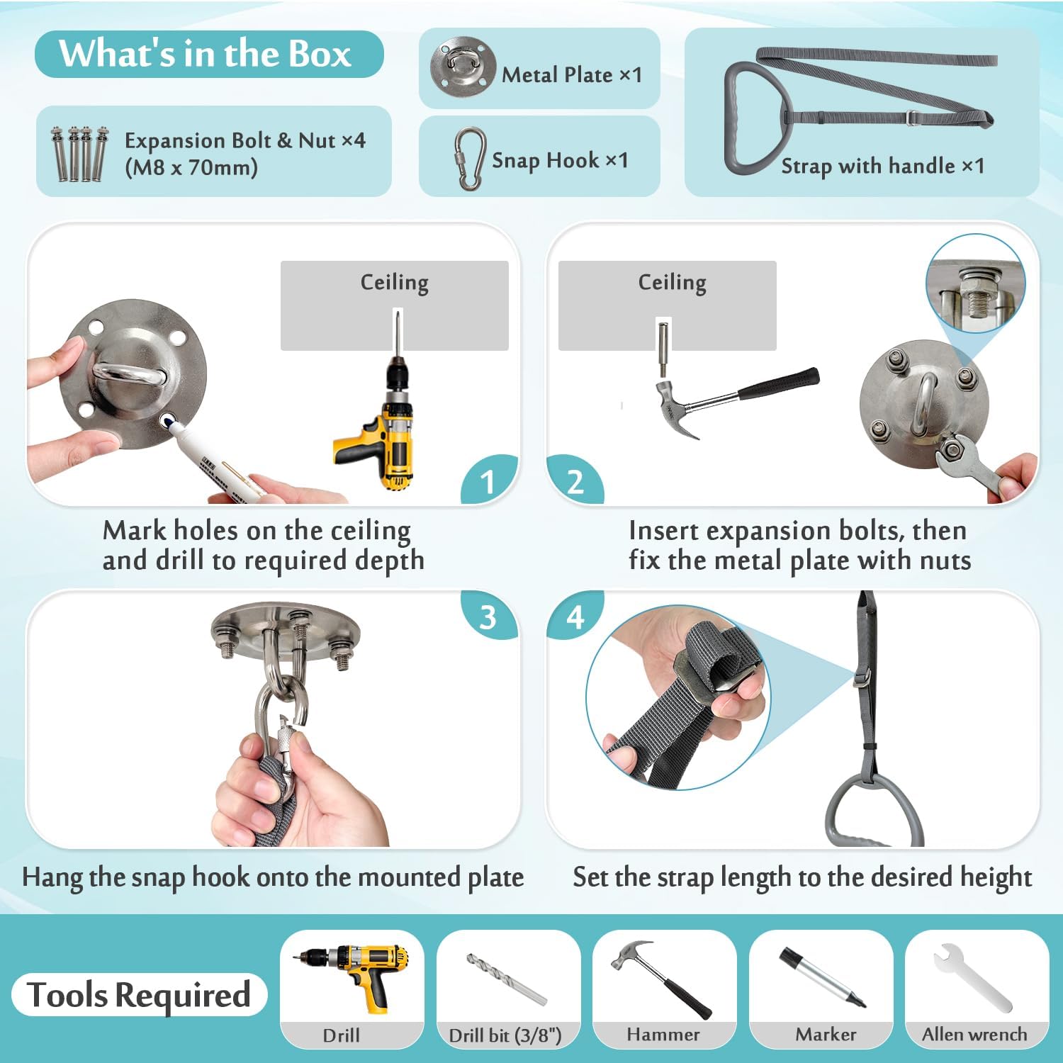 【Ceiling Trapeze Bar】Portable lift assist handle features a handle, strap, and metal hardwares; Can be securely mounted to the ceiling and adjusted in height within minutes; Compatible with most hospital beds, home care medical beds or standard beds.