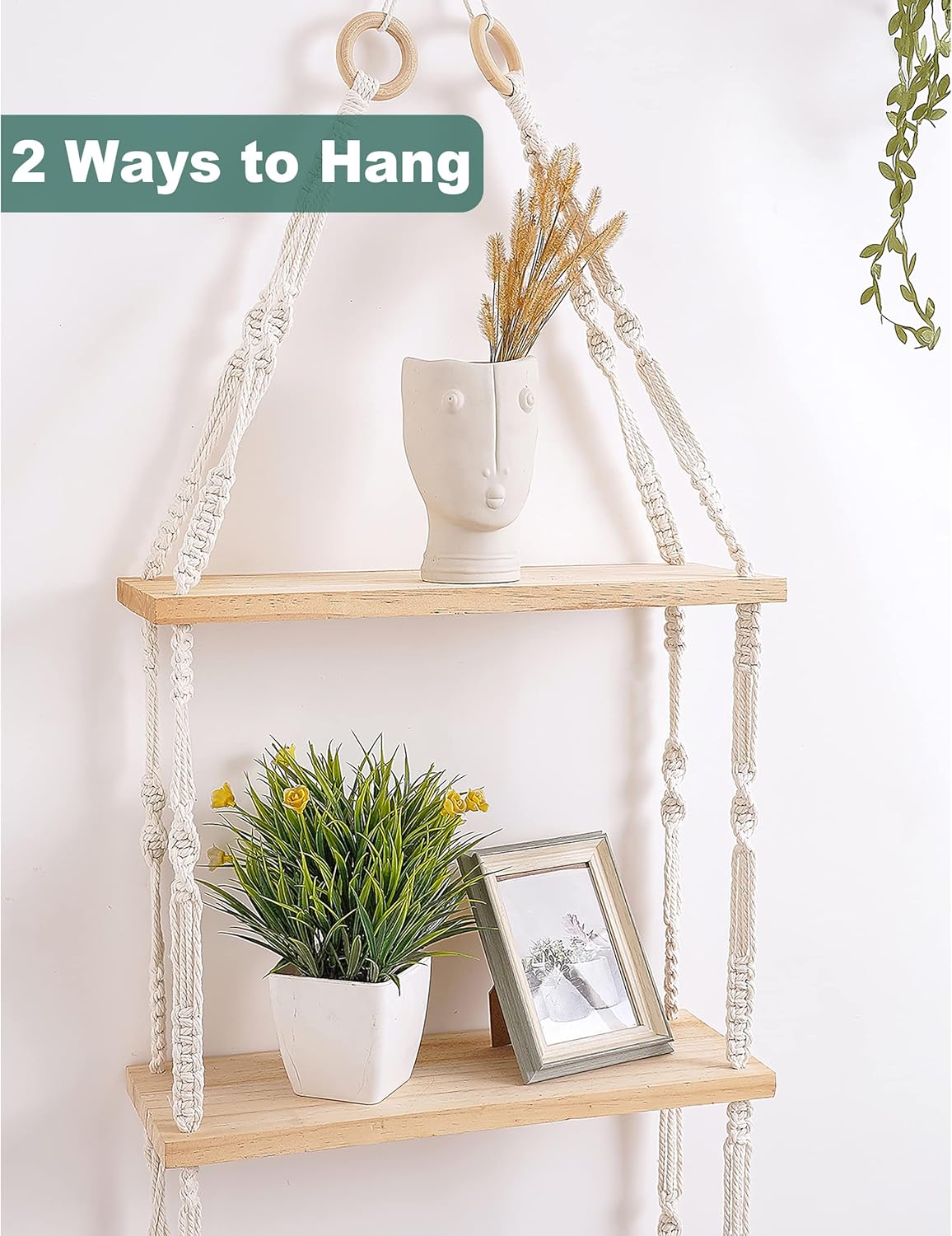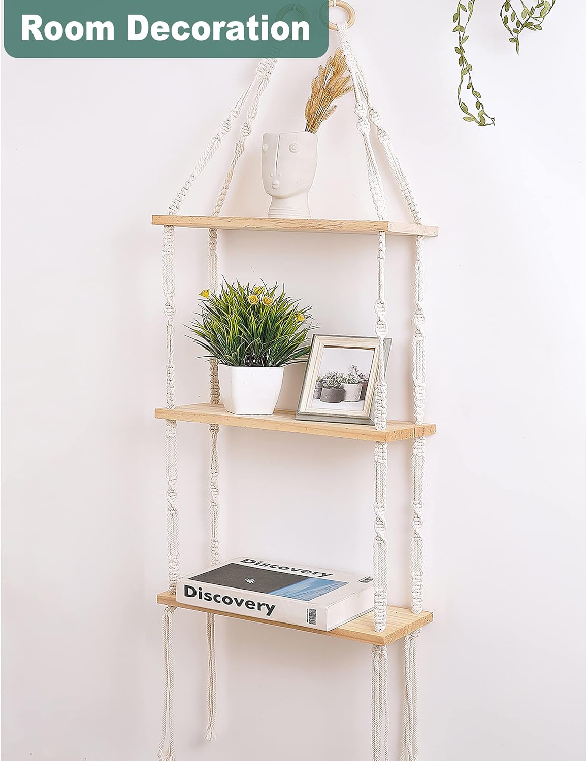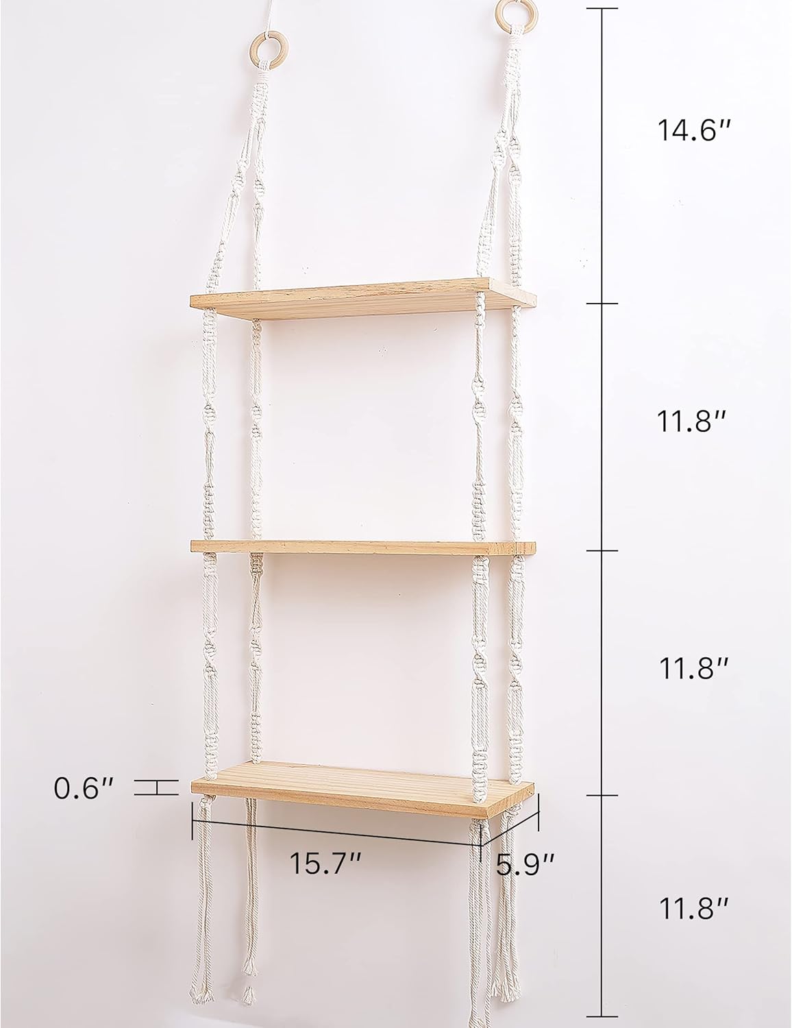 【Multifunctional Hanging Shelf】With the exquisite design, this 3-tier boho hanging shelf can bring stylish texture to your walls. Meanwhile, with enough space between two planks, it can also be used as a display and storage organizer. Great for apartment, bedroom, bathroom, living area, farmhouse, work space etc.