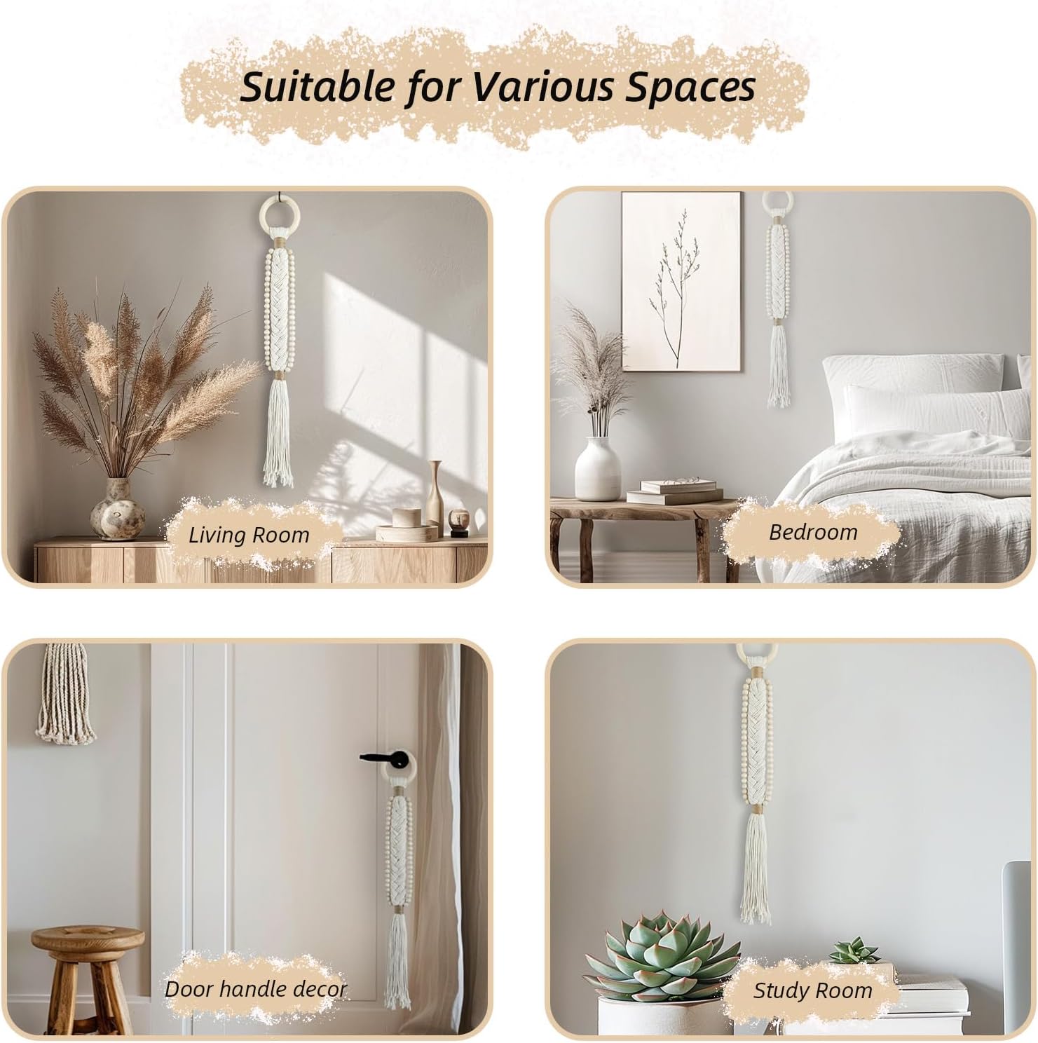 Bohemian with a Rustic Touch: These macrame wall hangings feature an elongated, minimalist design in neutral beige or fashion black, enhanced with tassels and wooden bead accents. Perfect for creating a cozy and rustic vibe in living rooms, bedrooms, dining areas, hallways, and dorm spaces