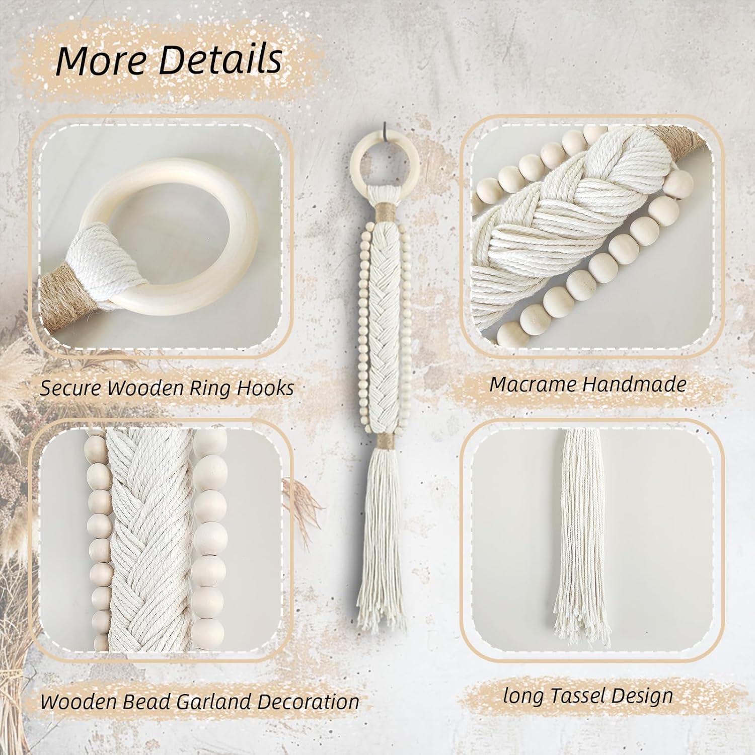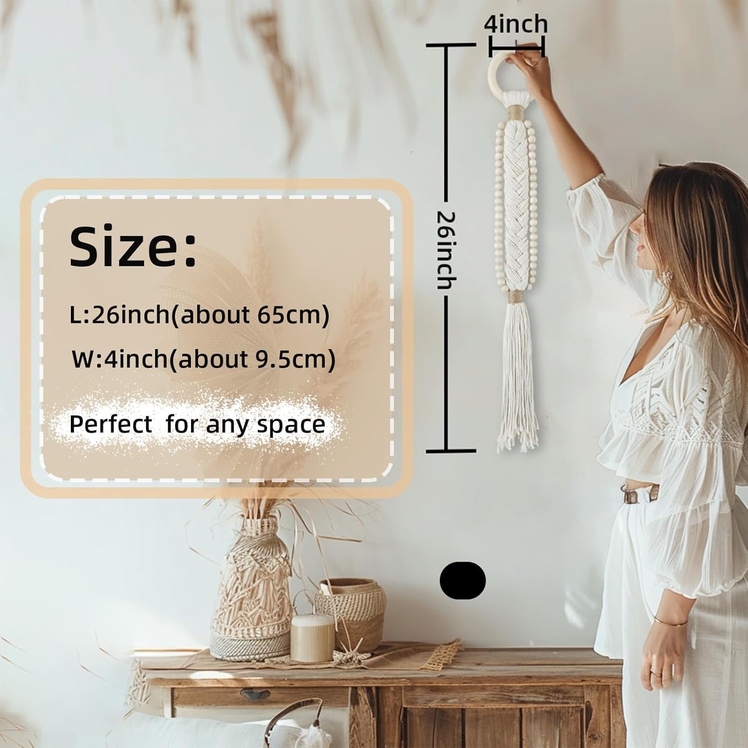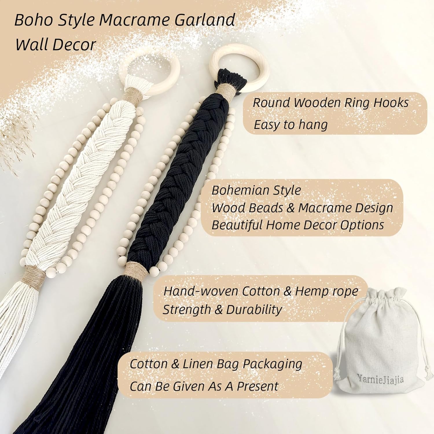 Durable Cotton with Wooden Details: Crafted from high-quality cotton threads, these hangings come in two classic colors—beige for a soft, natural feel and black for a striking, modern look. The sturdy wooden ring and beads on both sides complement the design and add textural interest.
