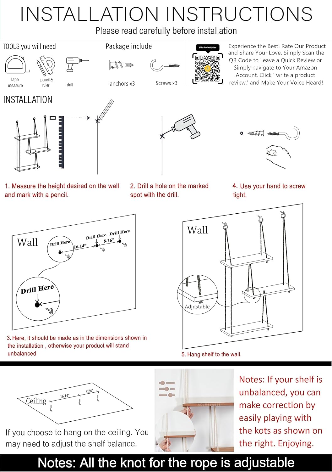 📦 These lovely hanging rope shelves for your wall are 6.5D x 16.78W x 36.22L. The package includes 1 macrame wall hanging shelf (3 tier), 3 expansion plugs, and 3 screw hooks to easily mount the shelves. The instructions are clear and shelf mounting is not hard at all. The shelves are adjustable once hung if needed.
