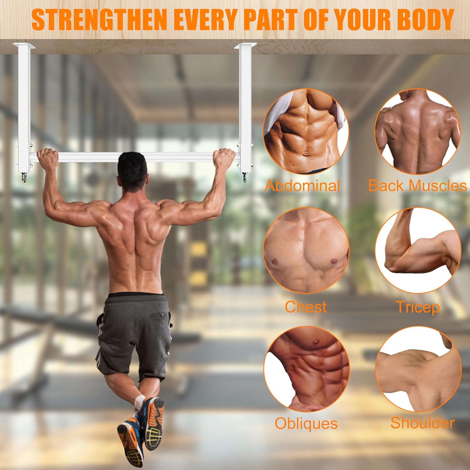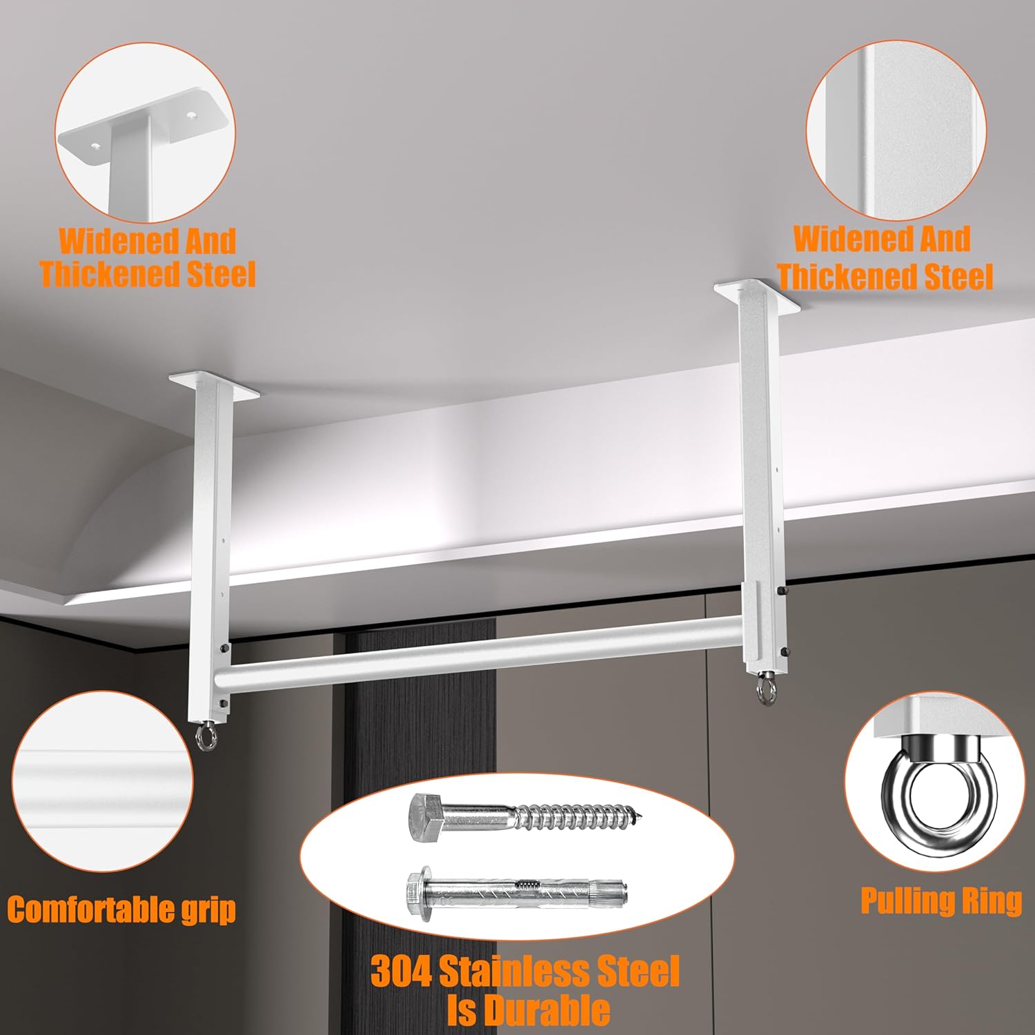 【FLEXIBLE EXPANSION, MULTI-GRIP ADAPTABILIT】The ceiling pull up bar accommodates various grip styles, including wide and narrow grips. Equipped with dual anchor points, it supports multiple training accessories: TRX suspension straps, resistance bands, yoga straps, and power ropes. Meets diverse muscle group training needs while balancing fitness professionalism and usage flexibility.