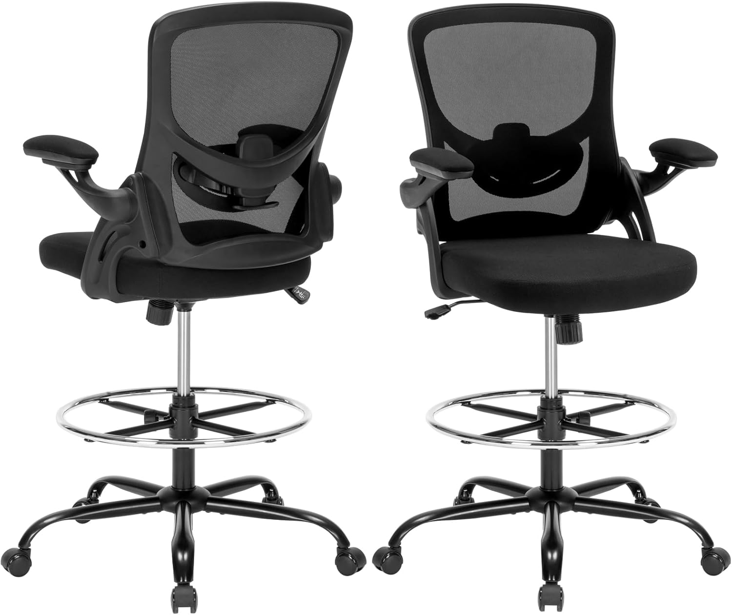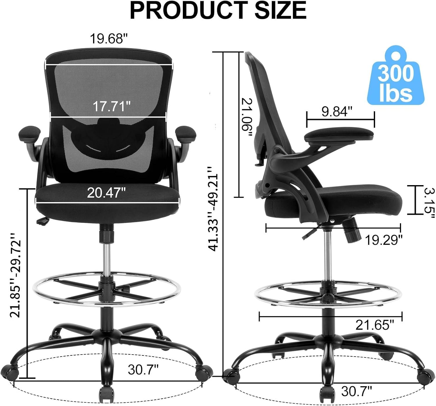 【ADJUSTABLE DRAFTING CHAIR】This swivel drafting chair is designed with a height adjustable footrest ring, help you move your feet more frequently, reduce the pressure on the back of your legs and improve comfort, adjustable seat height of 21.85-29.72 inches, adjustable padded armrests can be flipped up 90° and forward adjustment to fit different needs and save space, which is very suitable for standing desks, sitting desks and bars