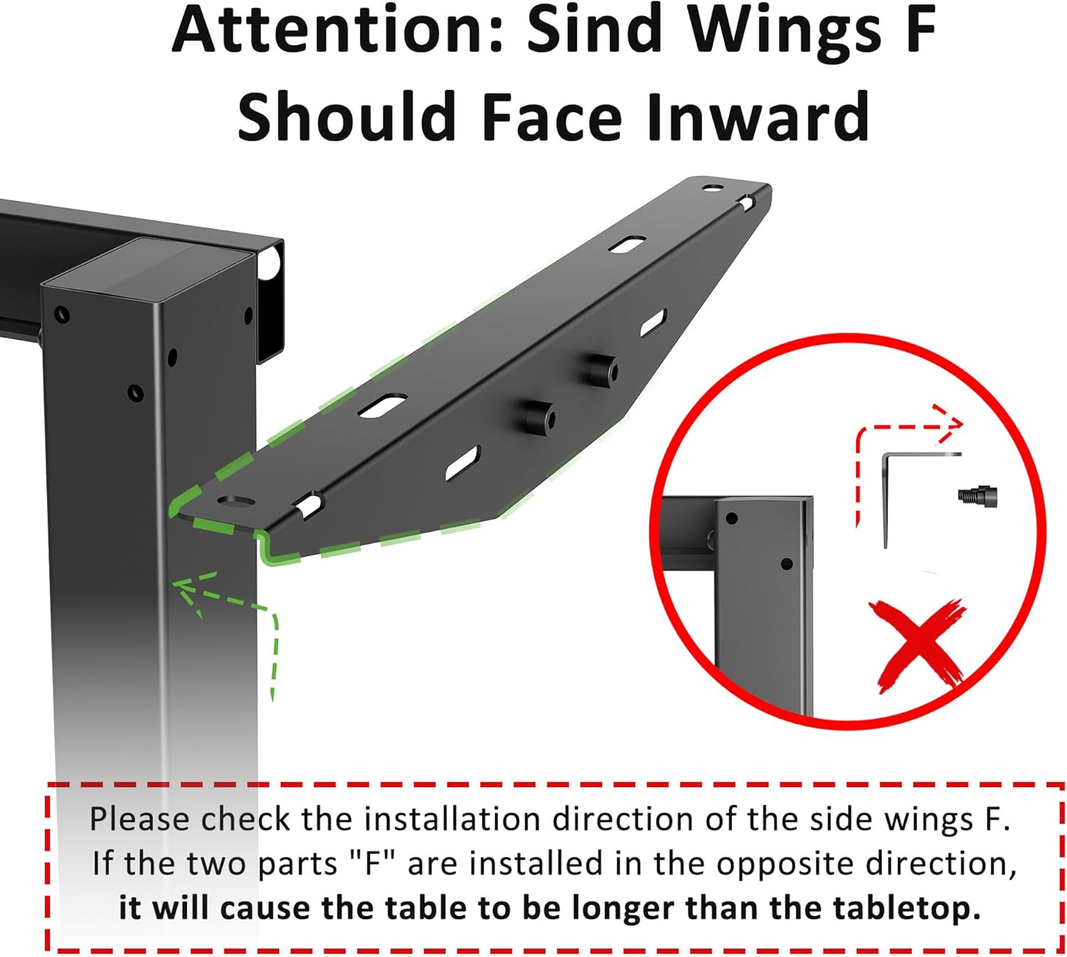Attention: Sind wings “F” should face inward. If the two parts “F” are installed in the opposite direction, it will cause the table to be longer than the tabletop.