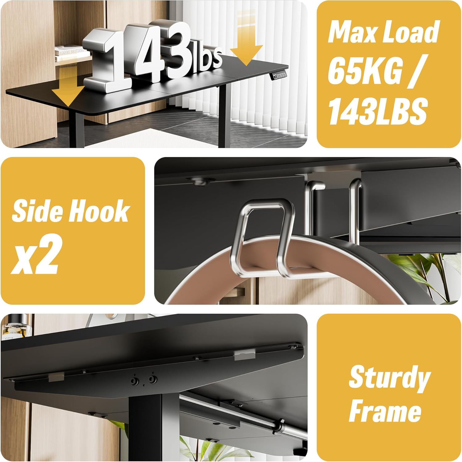 Spacious Work Area: The desktop size of this standing desk is 55 x 23.6 inch, which provides space for various monitors and laptops. You can put all the necessary office supplies on your electric stand up desk. There are hooks on both sides of the table so that you can hang the bags or headphones for easy storage