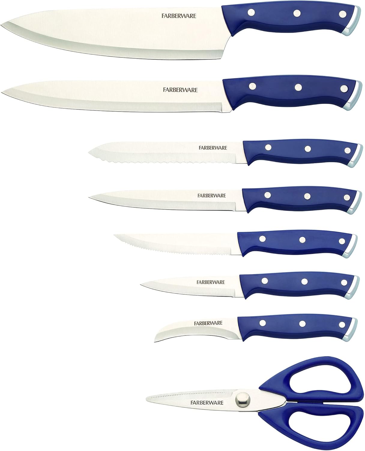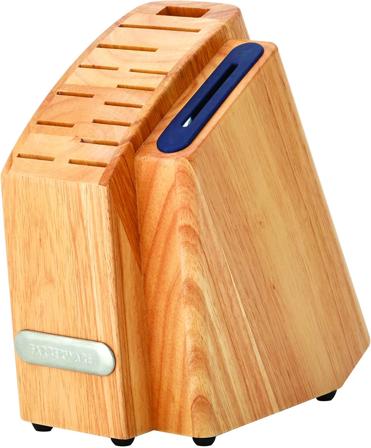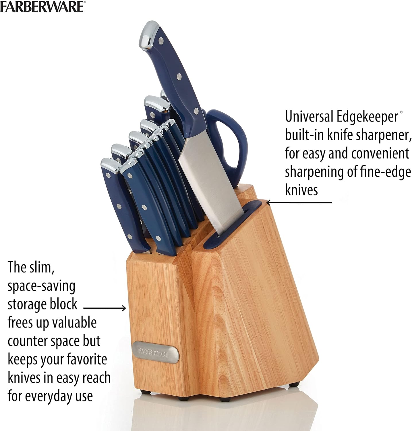 Always have the right sharpened knife on hand, with this Farberware Triple Rivet Ink Blue Slim Cutlery Block Set with Built-In Edgekeeper® Sharpener. Each knife has a fine edge, high-carbon stainless steel blade and ergonomically designed plastic handle that provides a comfortable grip. The slim design saves counter space, and the set features blue handles with triple rivets and endcap accents in a natural hardwood block that complements any decor and keeps all your essential knives organized and within reach on your countertop. This unique block also features an Edgekeeper(R) Sharpener slot. If you need to sharpen a blade, simply slide it in and out of the slot for a quick and convenient edge enhancement. 14-piece set includes: 8-inch chef knife 8-inch slicing knife, 5-1/2 inch serrated utility knife, 5-1/2 inch fine edge utility knife, 3-1/2 inch paring knife, 3-inch birds beak paring knife, six 4-1/2 inch steak knives, all purpose shears, and natural hardwood storage block with built-in sharpener. Hand-wash knives with warm water and a mild detergent then rinse and dry immediately. Stainless steel knives are not dishwasher safe.