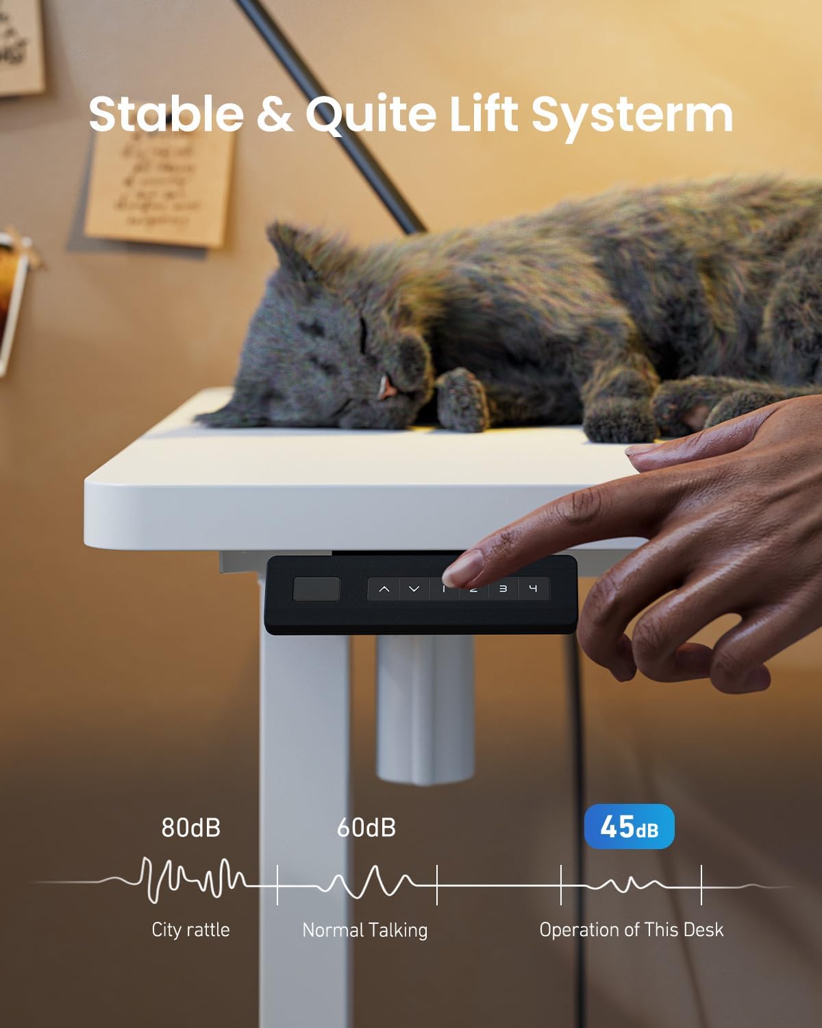 【Stable & Quiet Lift System】The lift system with sturdy steel. Contained an industrial-grade steel frame that able to support up to 176 lbs. Maximum lifting speed: 20mm/s, no-load noise≤55db.