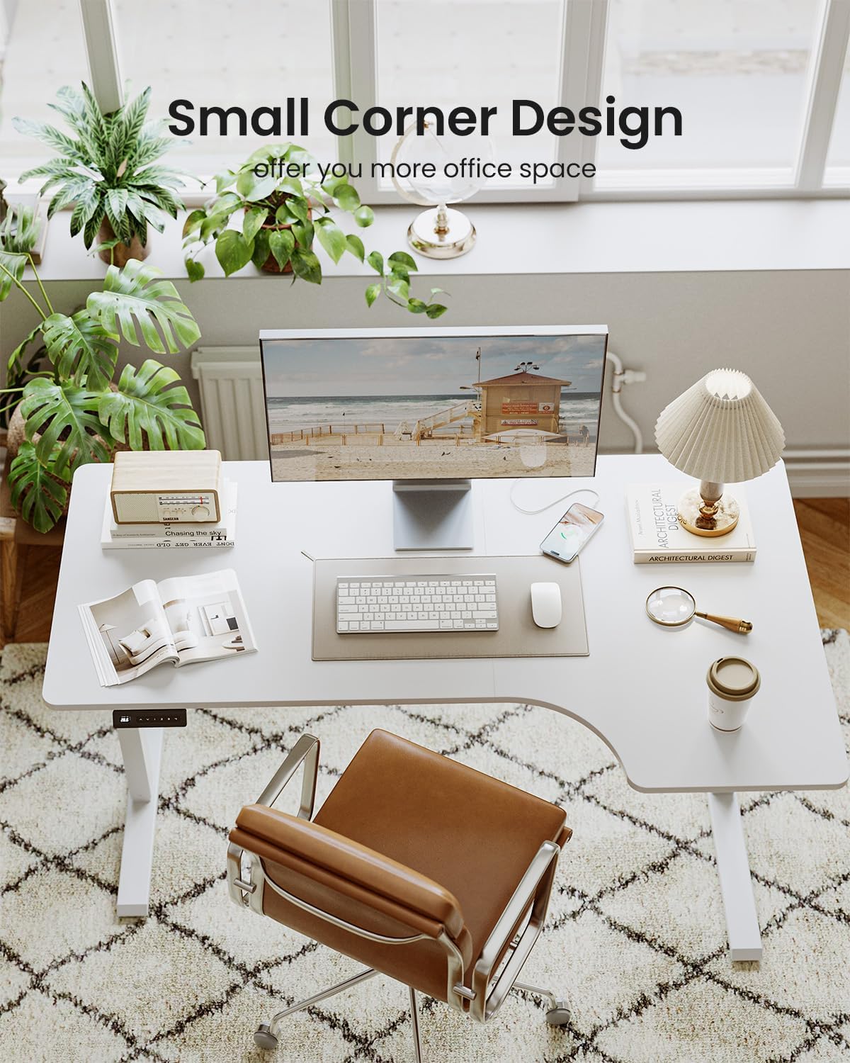 【55 inch Ample Workspace】This large corner table offers a 55 inch workstation, the right workspace for documents + the center zone for electronics. Two sections operate independently — your laptop, handwritten notes, and tools spread out without crowding.