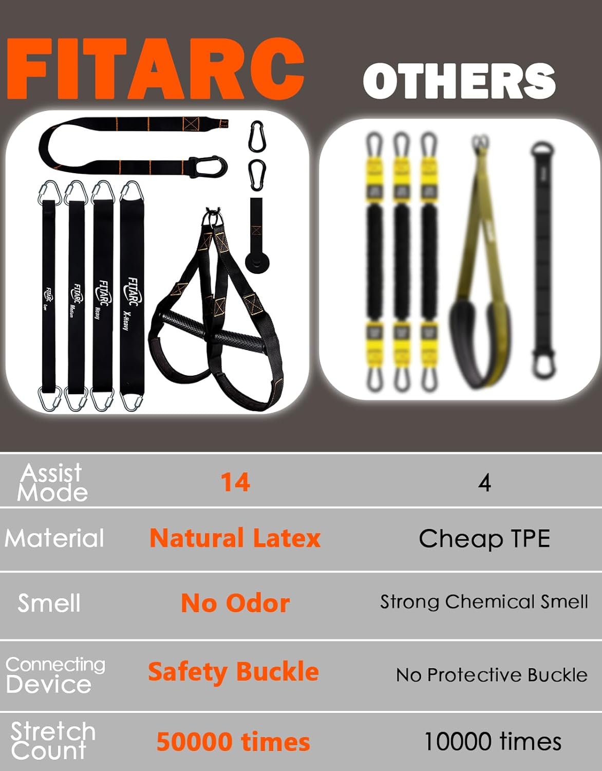 Fitarc Pull-up Assistance Bands are made from high-strength nylon fabric and natural latex, featuring 7 adjustable height settings to fit different pull-up bar heights and accommodate users of various heights. You can also increase the assistant force by placing the foot step higher, the resistance bands can stretch longer to provide higher resistance. We provide 4 different resistance bands that can be easily detached, each band has two triangular carabiners with locking mechanism. With up to 14 possible combinations, you can adjust the level of assistance to suit your strength needs. Unlike other assistance bands on the market, that use frabric to cover up TPE bands, we use natural latex bands, which offer superior durability and resistance. The thicker, wider design provides an ultra-strong pull, capable of offering up to 300lbs of assistance, making it ideal for heavier or less powerful individuals. Multi-functional Handle/Foot Step Design: We’ve incorporated a handle above the foot step, and with the use of resistance bands and door anchor, it can be utilized for various exercises such as bicep curls, rows, shoulder training, chest presses, and crab walks. This versatile design saves you the cost of purchasing additional resistance bands. Struggling with insufficient strength for pull-ups? If you want to perform pull-ups but lack the necessary strength, our assistance bands will help you progress through the beginner phase. From 0 to 1, we’re here to support your journey as you continue to build strength and reach new heights.