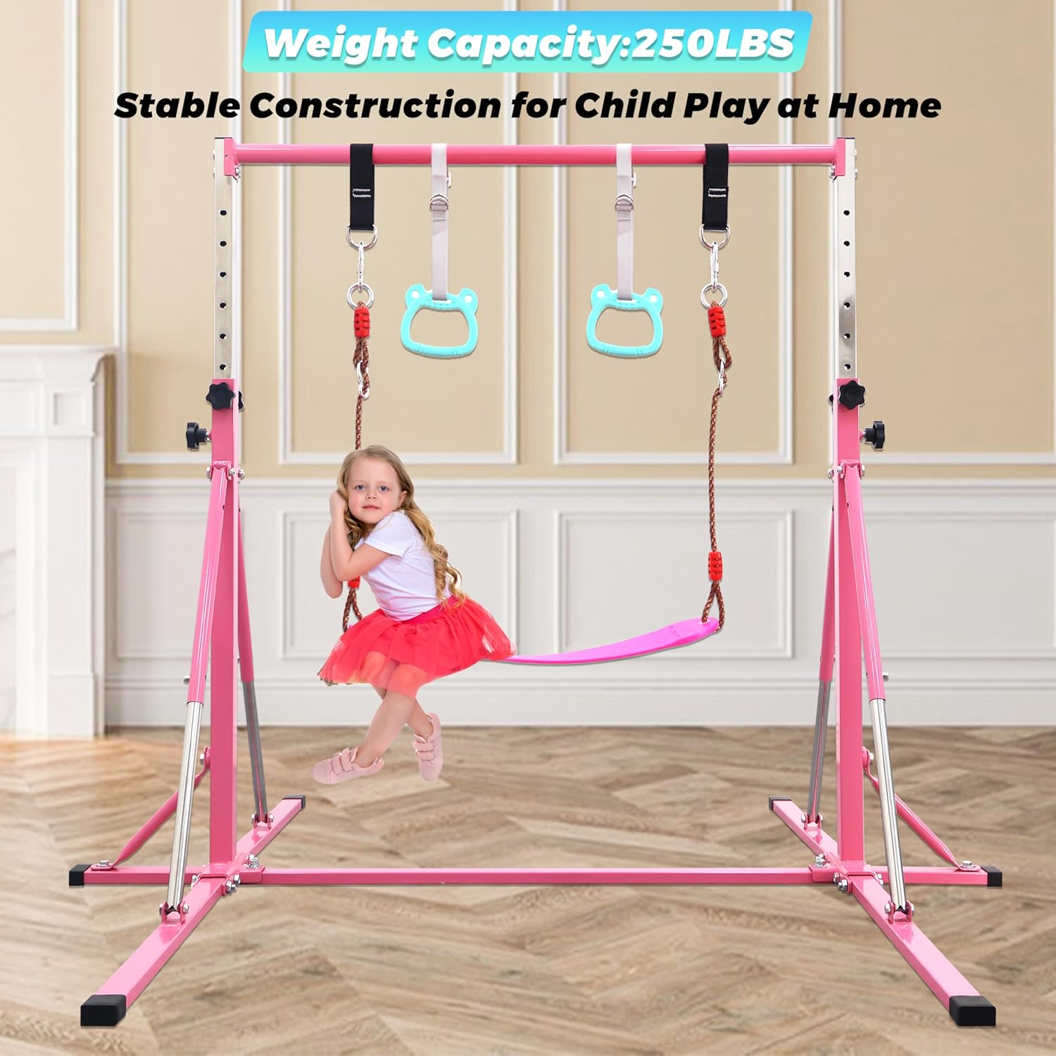 Foldable Gymnastics Bar :The new designed gymnastics bar can be easily folded in seconds by press spring buckles,Big triangle structure,Rings,Swing and Gymnastics mat with bar for choice,Firberglass cross bar support weight capacity upto 350 LBS,The stainless inner bar for folding will not hurt the surface and make it more easily to operate