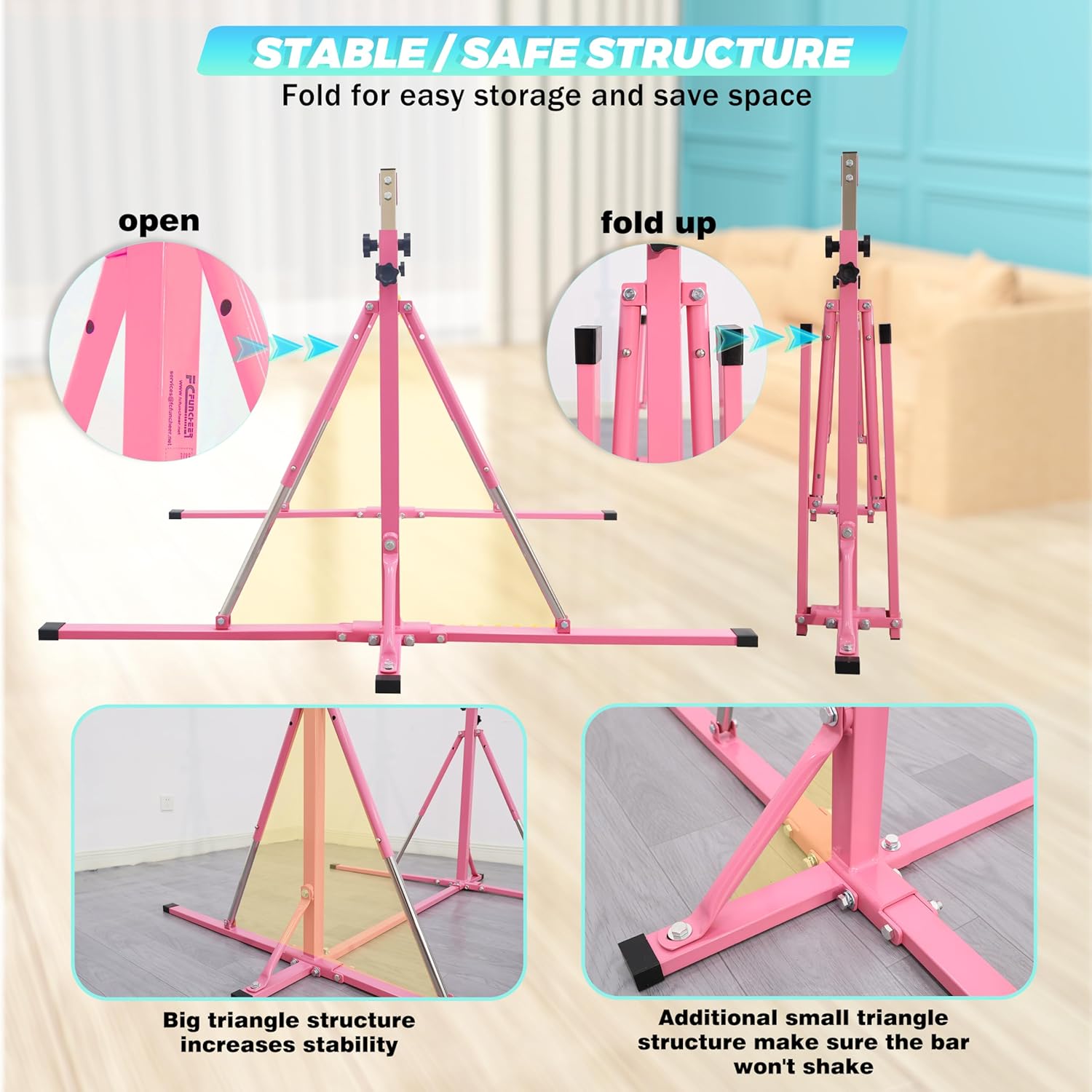 Professional Gymnastics Equipment for Kids: Made from high-quality carbon steel with safety powder coating surface, SIX BIG TRIANGLE Structure support the bar safety enough for basic skills gymnastics movements ,Height adjustable from 3′ to 5′ ,perfect for kids ages 3-15 to practice at home