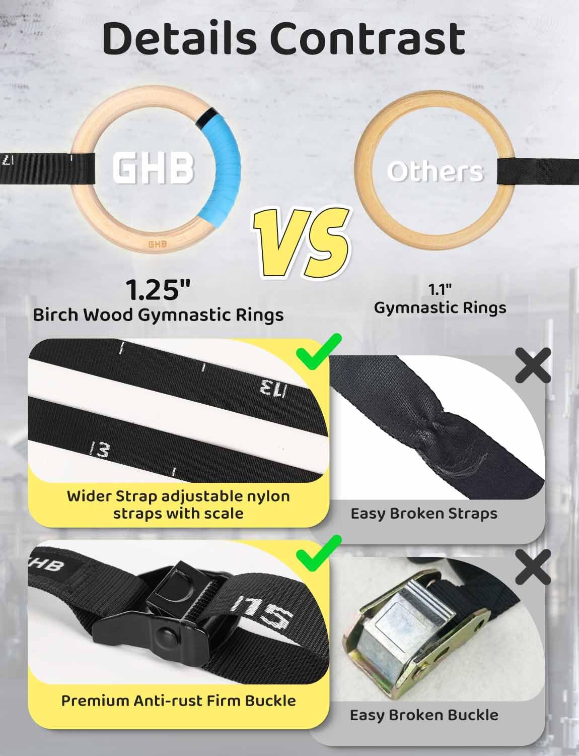 Common issues with gymnastic rings include buckles and straps that easily break or are difficult to adjust. To address these issue, GHB has introduced two upgraded buckles: a serrated buckle and a Swivel carabiner, along with two different-length straps with scale. All designed for easy and precise height adjustment.