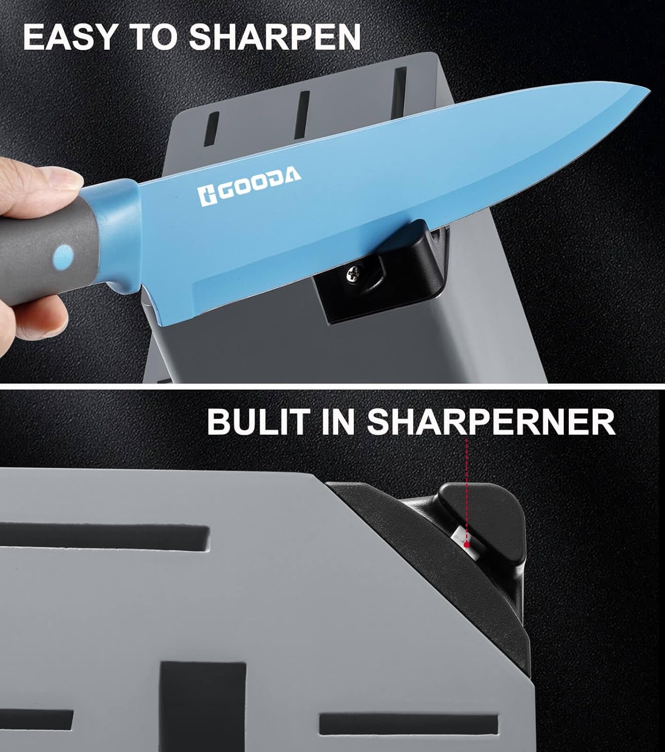 BUILT-IN KNIFE SHARPENER BLOCK: Kitchen knife sets with built-in sharpeners are very convenient and you can sharpen your knives with one hand. It saves you the trouble of finding a sharpener and sharpening your knives on a whetstone, which is great invention