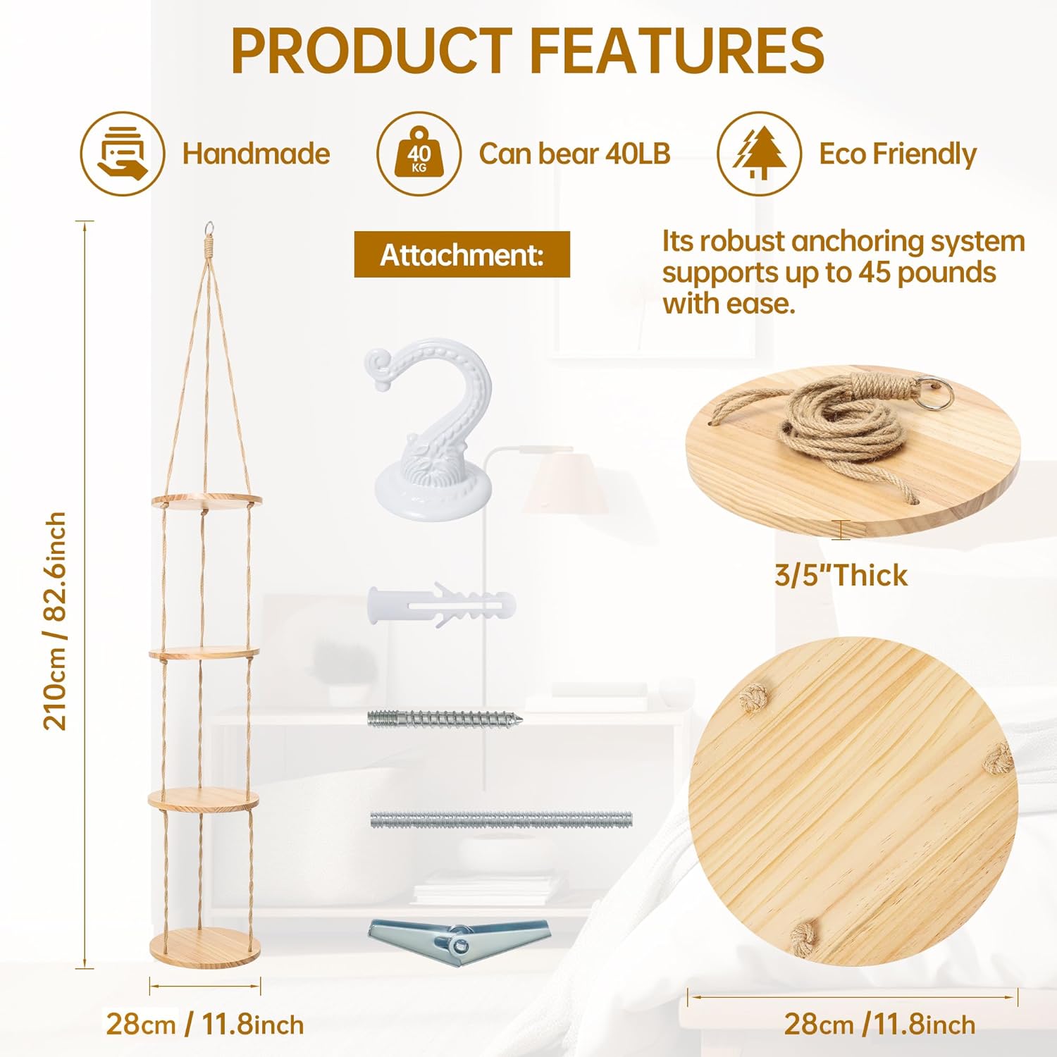 【 Premium Quality Materials】 Crafted from durable 4mm natrul jute rope and solid wood (11.8″ diameter, 3/5″” thick), this shelf features a waterproof, natural varnish finish for easy maintenance. Its spacious tiers are perfect for displaying a variety of items , from potted plants and candles to picture frames and collectibles.
