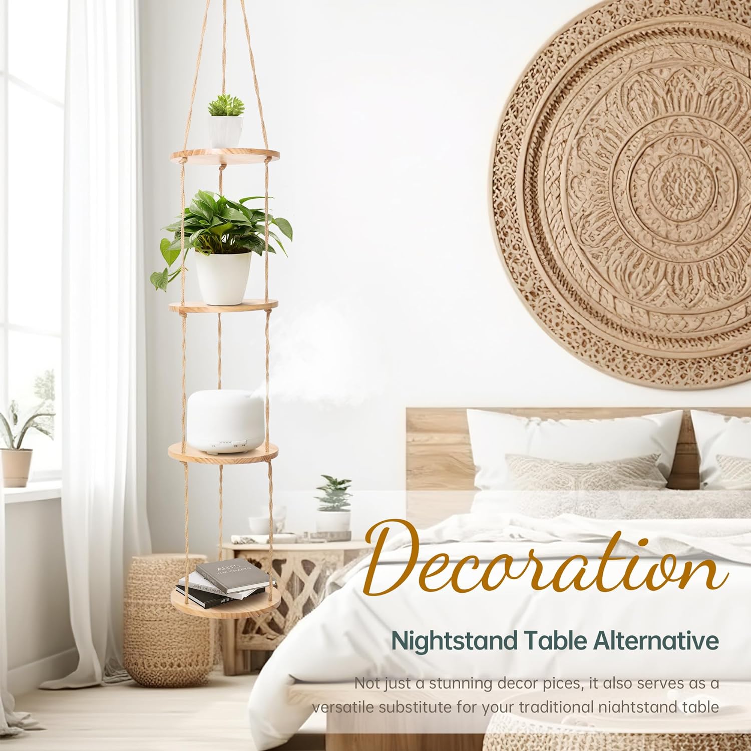 【Inspire and Be Inspired】 Elevate your decor and functionality with the 4-Tier Bohemian Macrame Hanging Rack. It’s versatile enough to serve as a plant or crystal display, a unique floating coffee table, or a charming nightstand beside your bed. Imagine it as a floating table or reading nook next to your workspace or relaxation area, adding both style and convenience