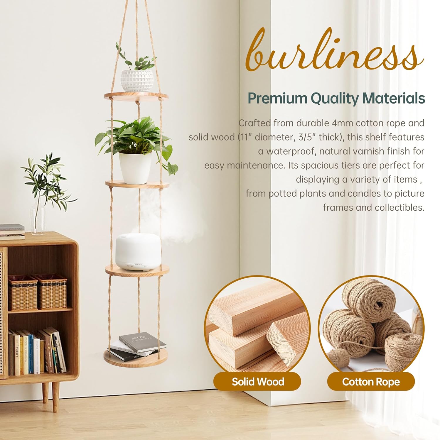 【 Premium Quality Materials】 Crafted from durable 4mm natrul jute rope and solid wood (11.8″ diameter, 3/5″” thick), this shelf features a waterproof, natural varnish finish for easy maintenance. Its spacious tiers are perfect for displaying a variety of items , from potted plants and candles to picture frames and collectibles.