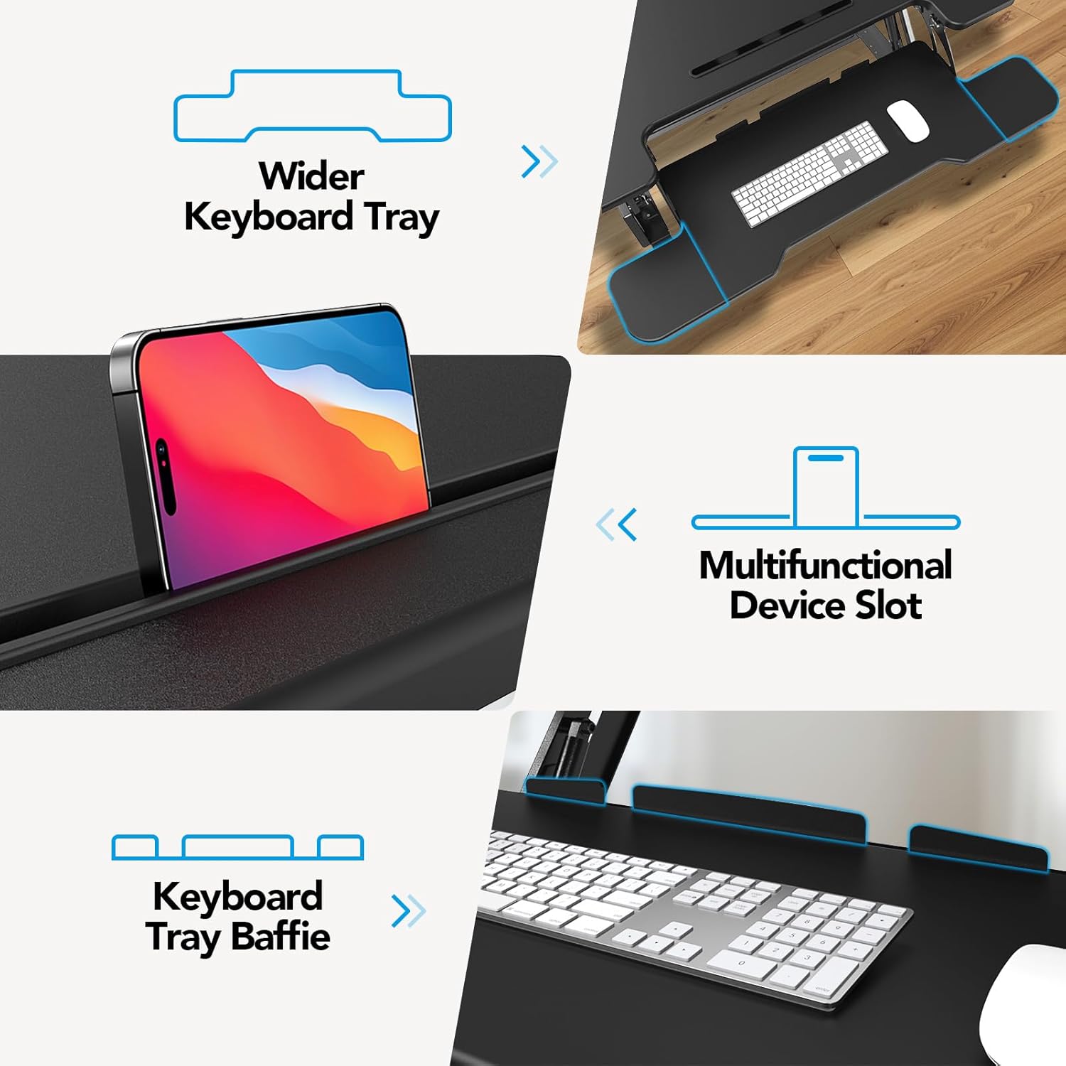 Spacious 36″ Surface: The desk riser features a 36″ x 20.5″ large top platform for dual monitors or a laptop and monitor combo. The optional 36″ x 8.3″ keyboard tray fits a full-size keyboard and mouse. An integrated device slot holds your phone or tablet for easy viewing and multitasking.