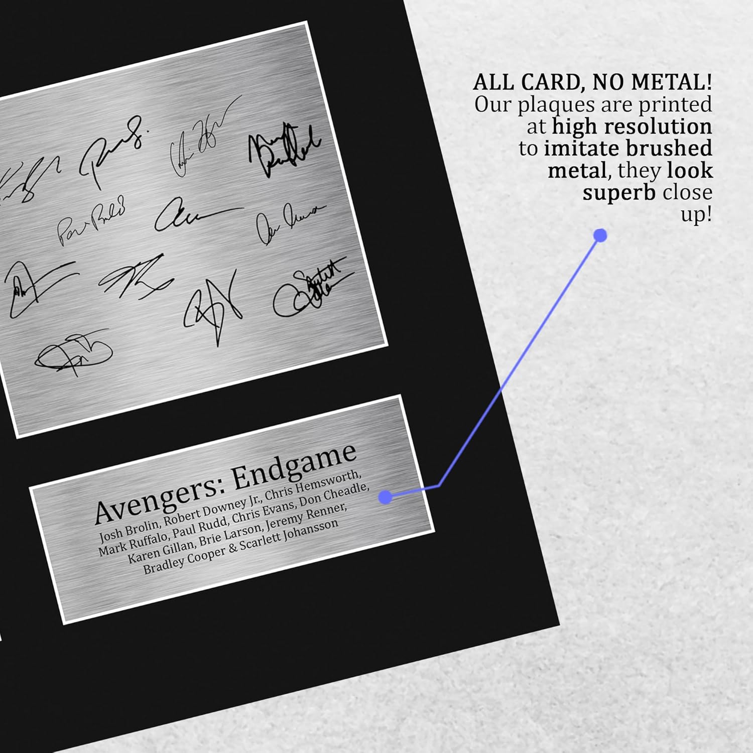 Professionally made in our studio, this Avengers Endgame Cast display makes for an ideal gift idea. This laser printed quality photograph is mounted in a precision cut three windowed acid-free matt black display board. To the left of the display there is the main image. To the right of the display there are two metallic effect plaque areas for printed copies of the name and autograph signature. These mounts also come with a ridgid backing board making them very sturdy and can be displayed or hung as they are. Alternatively we offer a framed version too. Lightweight, but of the highest quality, these make the ideal Christmas/Birthday gift for fans of all ages, and best of all, they definitely won’t break the bank!