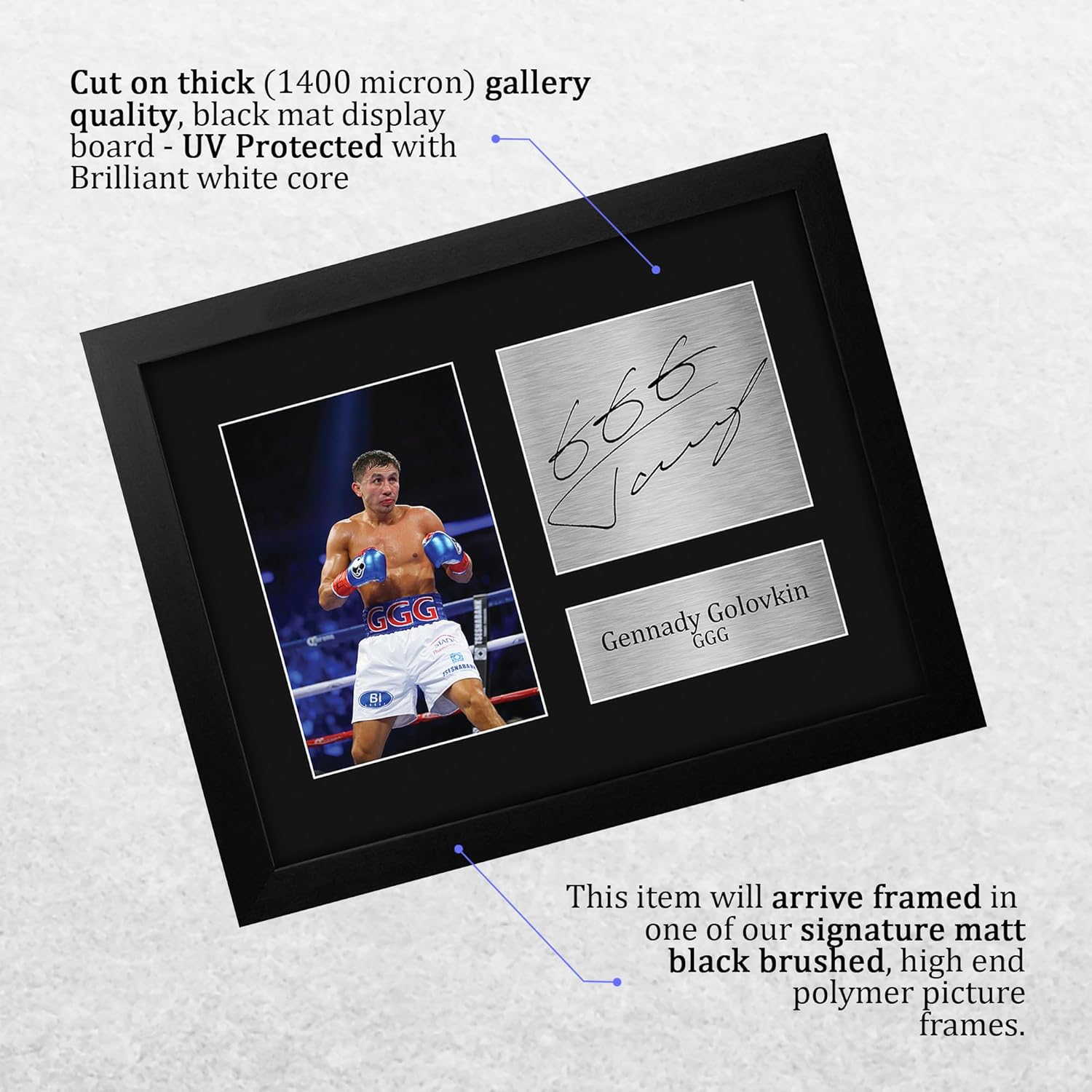 Professionally made in our studio, this Framed Gennady Golovkin display comes with a high-quality picture of Golovkin alongside a printed copy of his autograph signature. Mounted in a matt black using an acid-free display board, it’s perfectly finished with Golovkin’s name in a silver, mock printed plaque. This Print comes Framed in a sleek Black Polycarbonate frame that compliments the matt mount display. Lightweight, but of the highest quality, these make the ideal Christmas/Birthday gift for fans of all ages, and best of all, it definitely won’t break the bank!