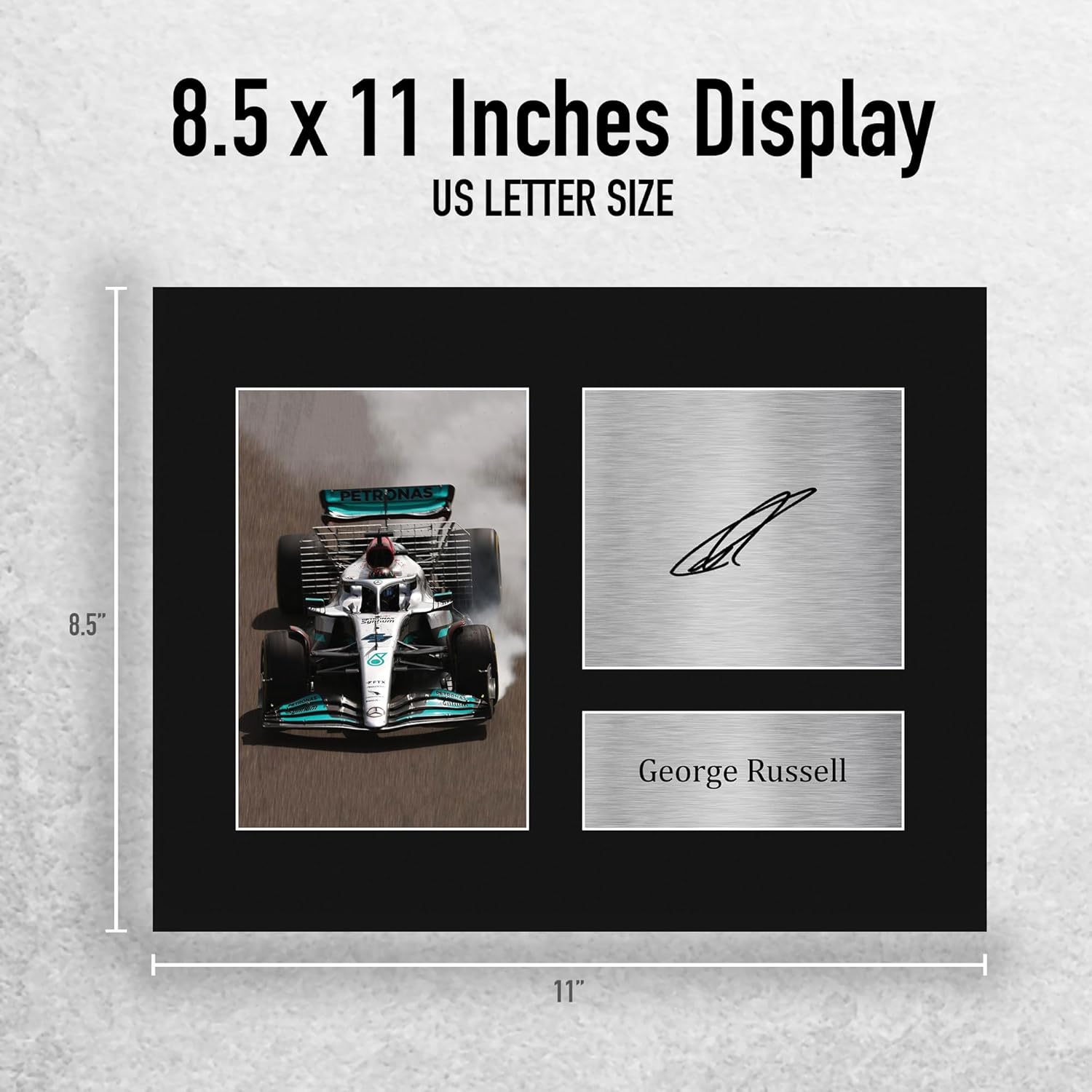 Professionally made in our studio, this George Russell display makes for an ideal gift idea. This laser printed quality photograph is mounted in a precision cut three windowed acid-free matt black display board. To the left of the display there is the main image. To the right of the display there are two metallic effect plaque areas for printed copies of the name and autograph signature. These mounts also come with a ridgid backing board making them very sturdy and can be displayed or hung as they are. Alternatively we offer a framed version too. Lightweight, but of the highest quality, these make the ideal Christmas/Birthday gift for fans of all ages, and best of all, they definitely won’t break the bank!