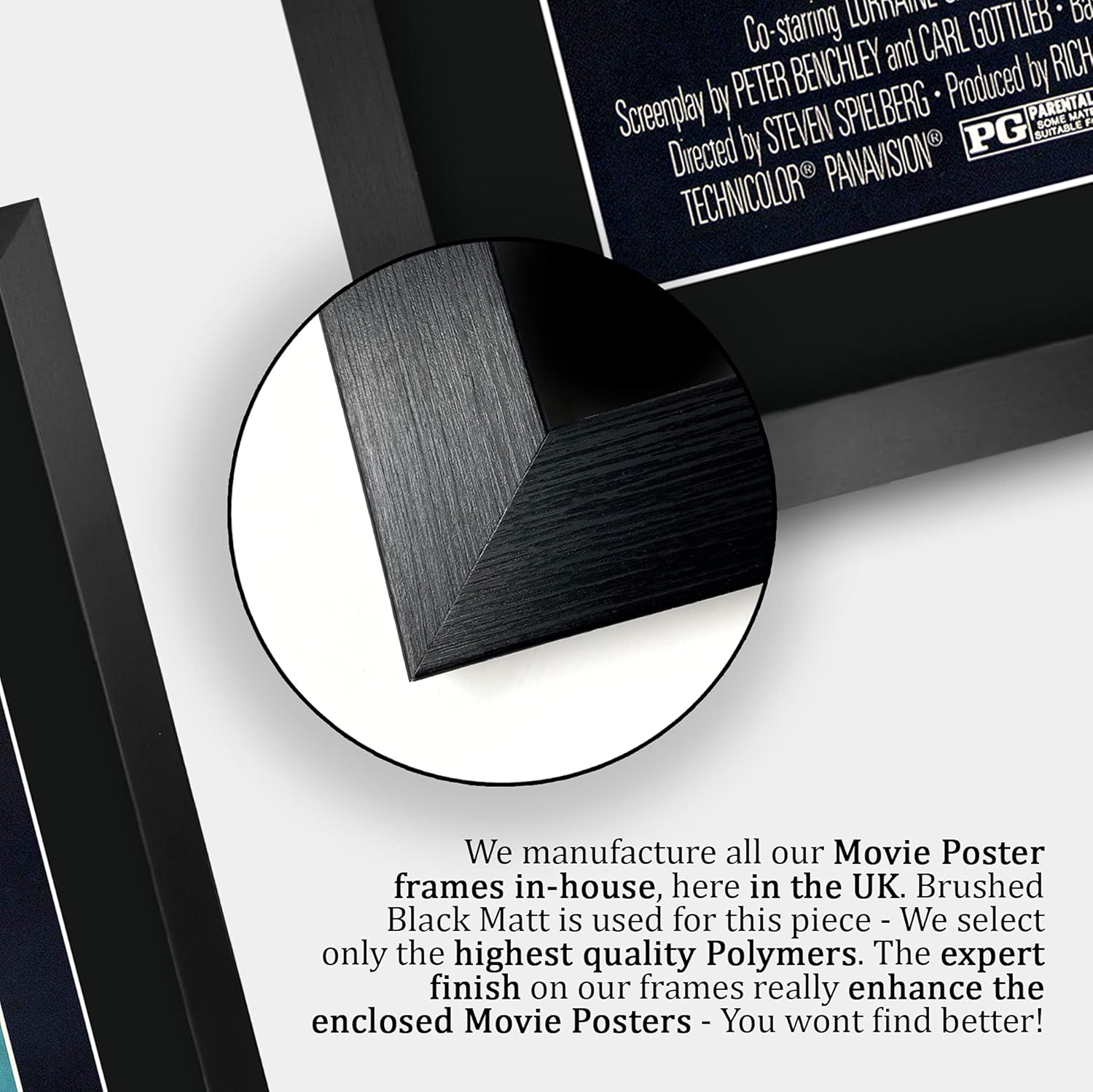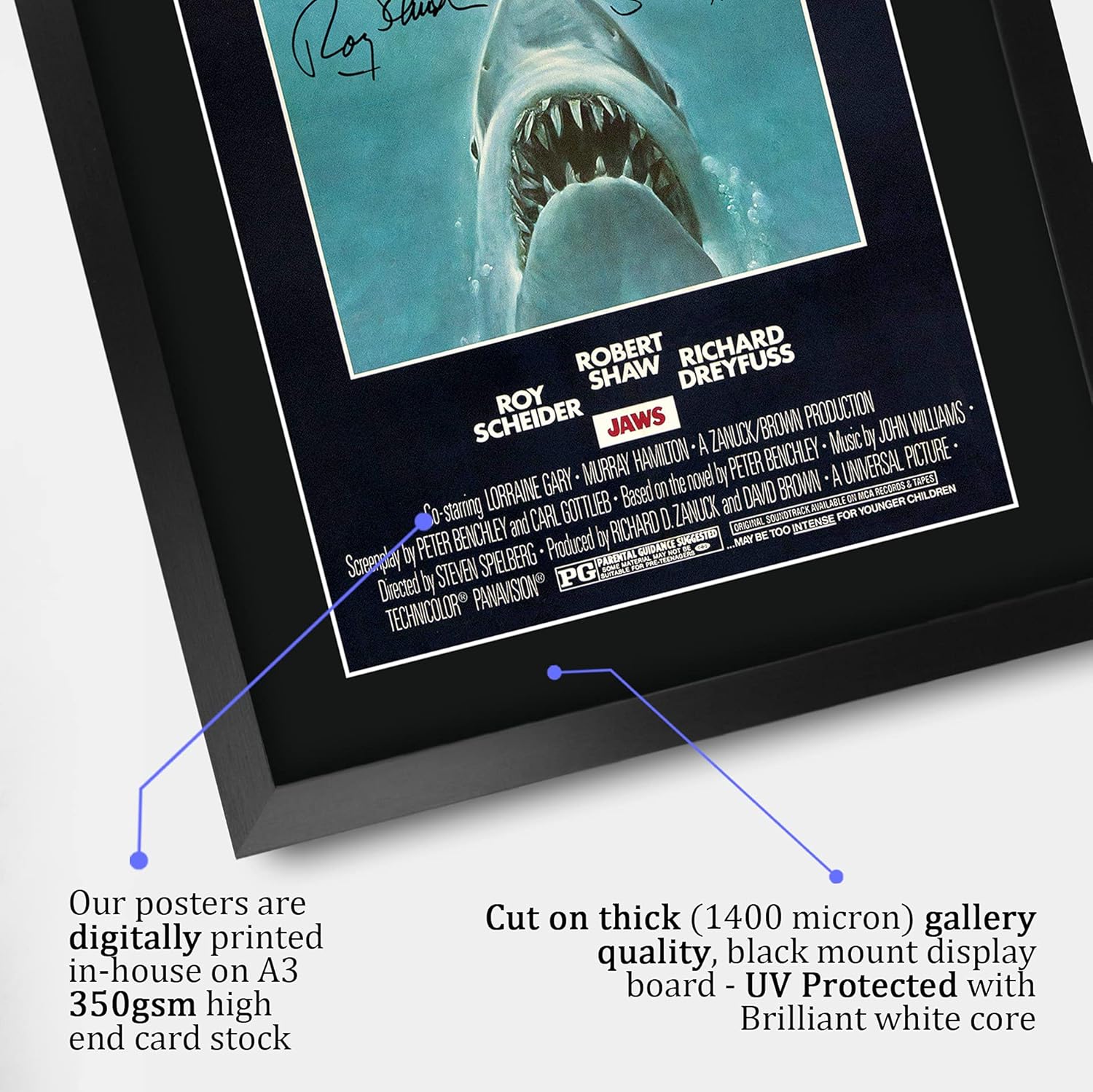 Professionally made in our studio, this Framed JAWS Movie Poster display comes with a high-quality picture of The Jaws Movie Poster alongside a printed copy of the Cast’s autograph signatures. Mounted in a matt black using an acid-free display board, it’s perfectly finished with Rob Scheider, Robert Shaw & Richard Dreyfuss’s Pre-Printed Autographs. This Print comes Framed in a sleek Black Polycarbonate frame that compliments the matt mount display. Lightweight, but of the highest quality, these make the ideal Christmas/Birthday gift for fans of all ages, and best of all, it definitely won’t break the bank!