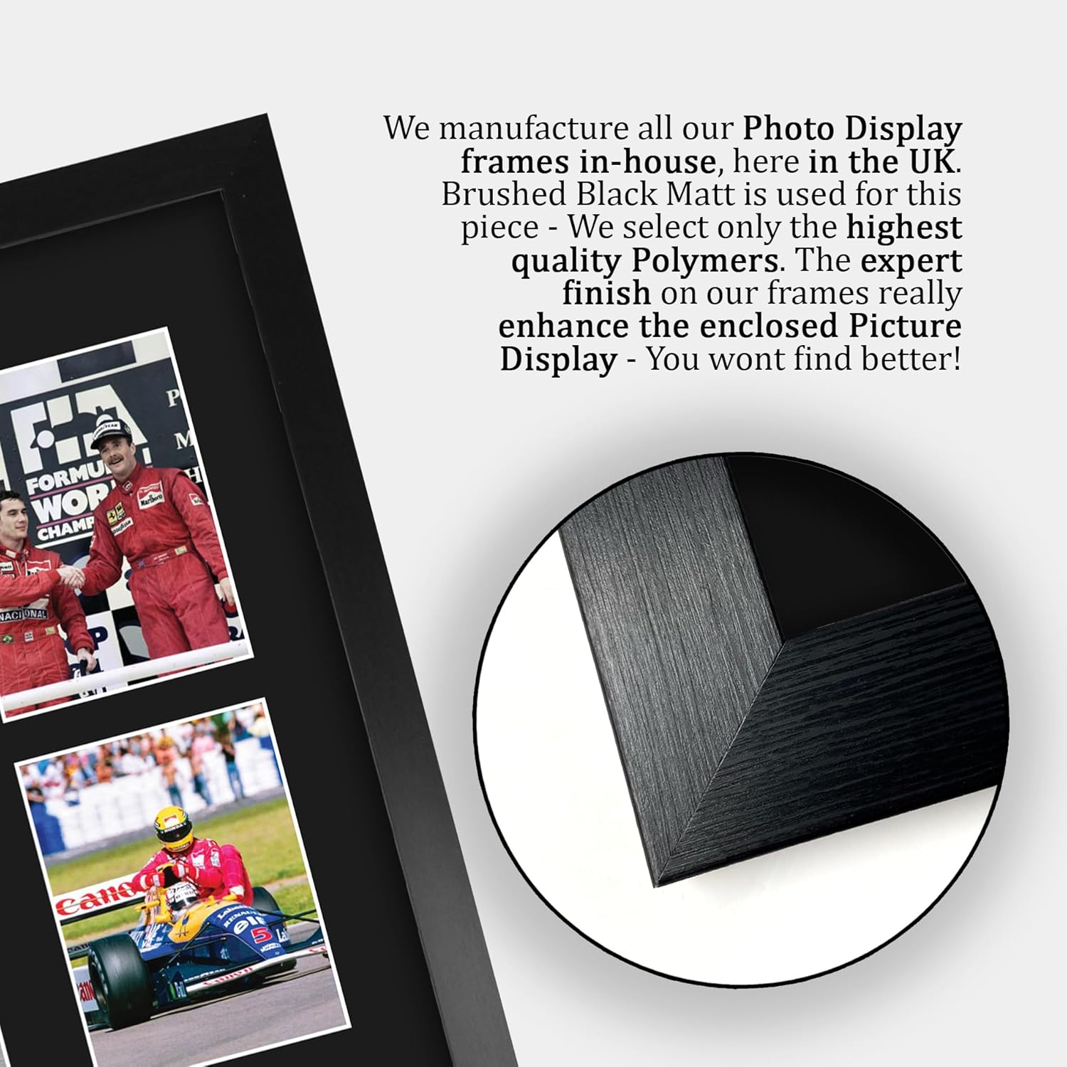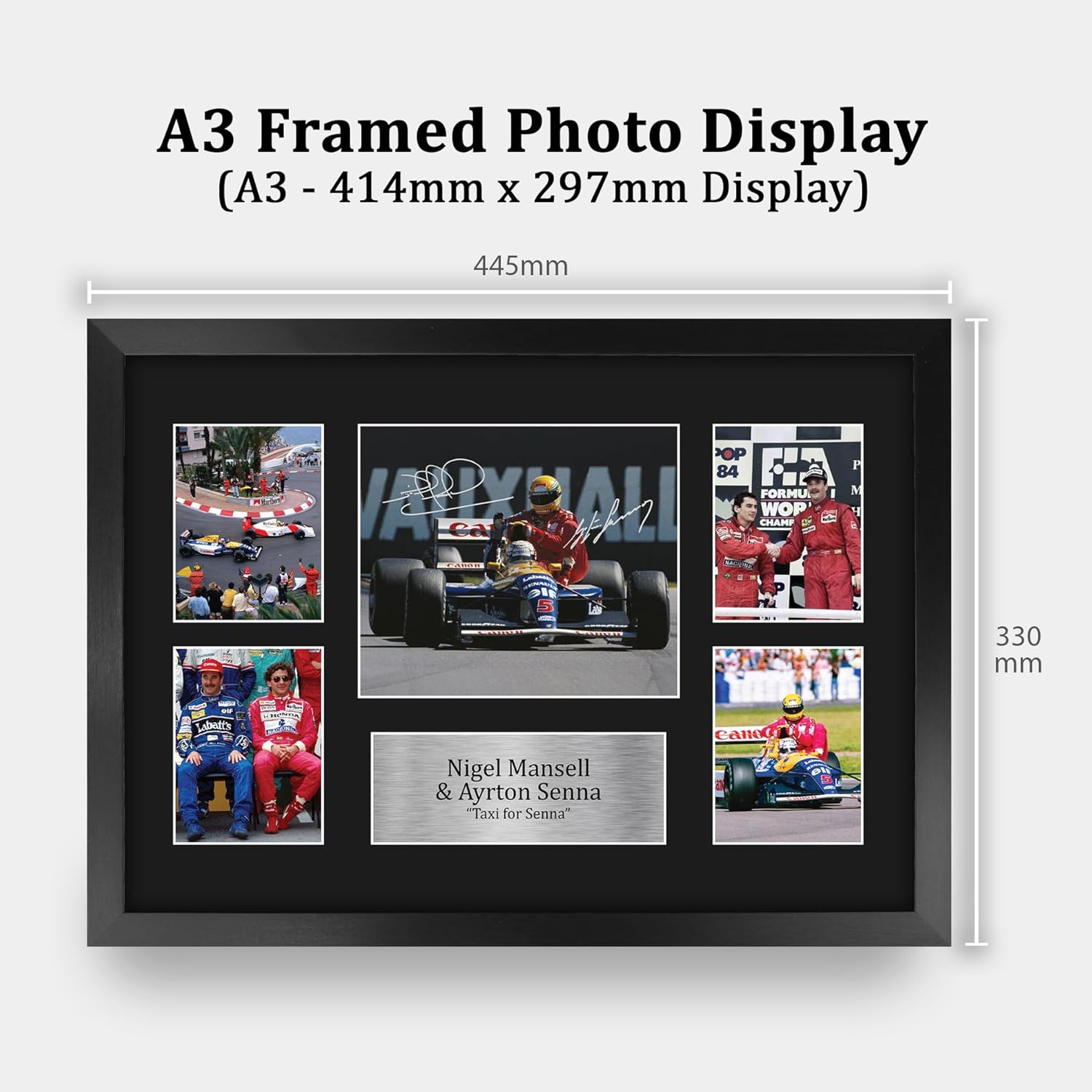 Professionally made in our studio, this framed Nigel Mansell & Ayrton Senna display makes for an ideal gift idea. This laser printed quality photograph is mounted in a precision cut six windowed acid-free matt black display board. To the left and right of the display there are four classic images. To the centre of the display a main focal image taking pride of place with printed signature overlay. Below this is a metallic effect plaque area with the name and career information. This item comes framed in a sleek black polycarbonate frame that compliments the matt mount display and a clear perspex front to keep it dust free and clean. Lightweight, but of the highest quality, these make the ideal Christmas/Birthday gift for fans of all ages, and best of all, it definitely won’t break the bank!