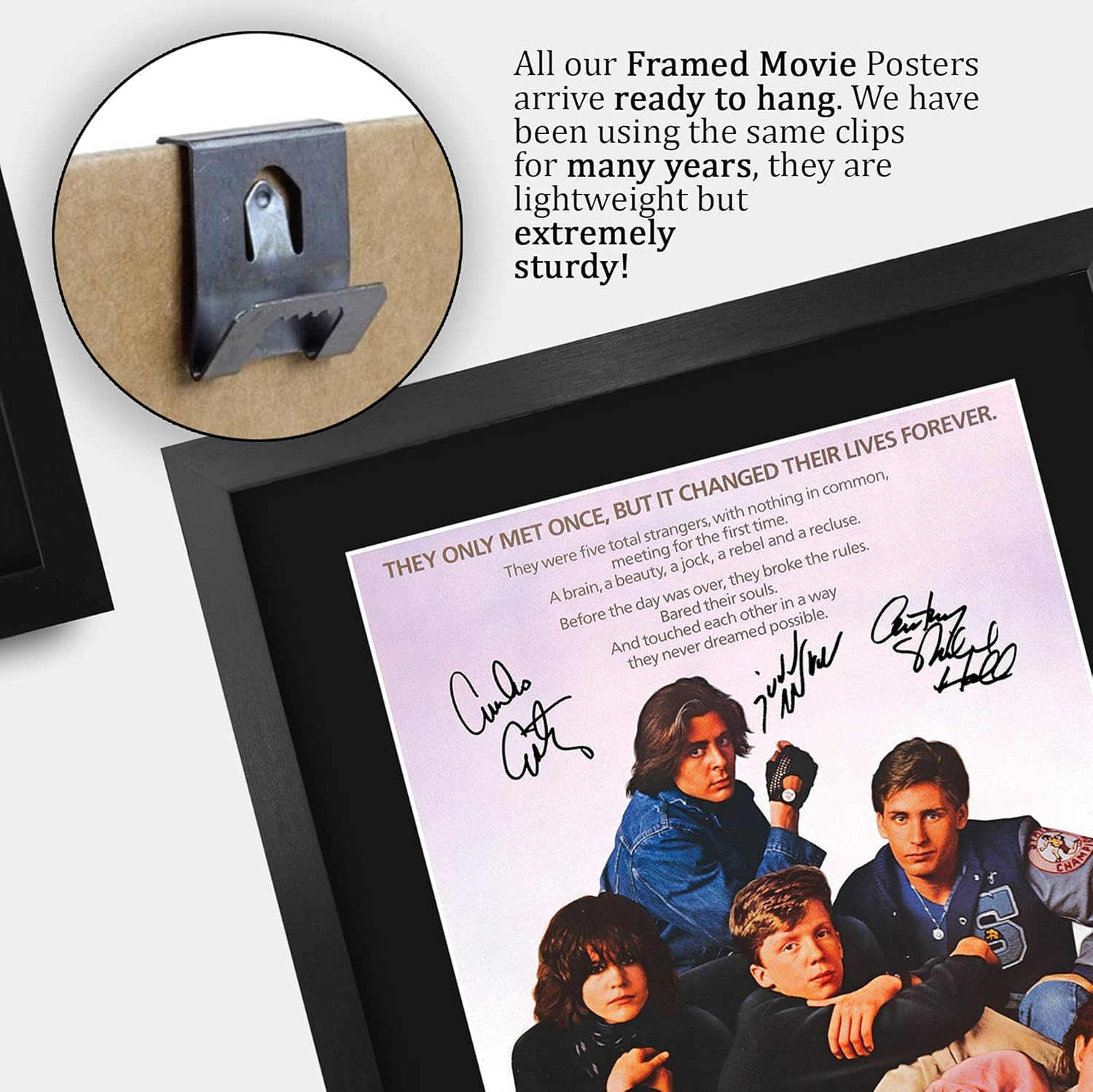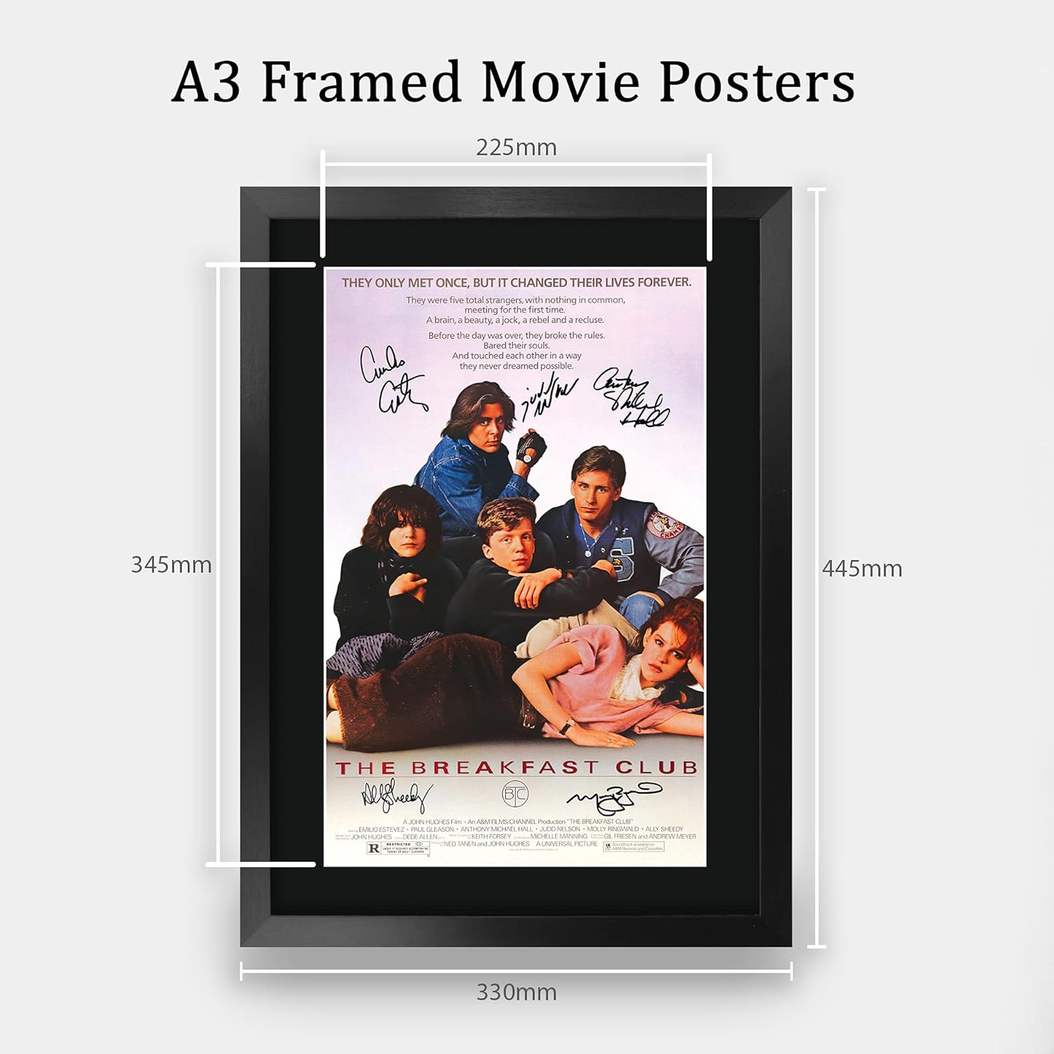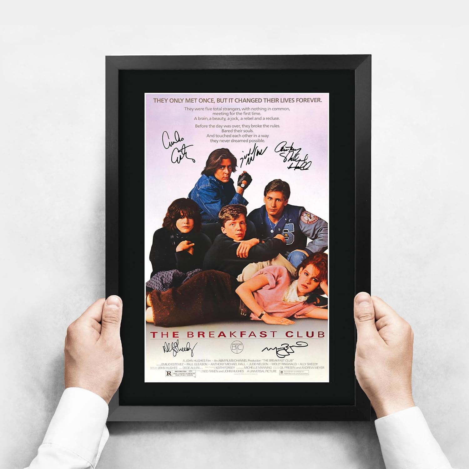 Professionally made in our studio, this 16″ x 12″ framed The Breakfast Club poster style display makes for an ideal gift idea. The display is overlaid with printed copies of the corresponding autograph signatures. This laser printed quality design is mounted in a precision cut single windowed acid-free matt black display board. This item comes framed in a sleek black polycarbonate frame that compliments the matt mount display and a clear perspex front to keep it dust free and clean. Lightweight, but of the highest quality, these make the ideal Christmas/Birthday gift for fans of all ages, and best of all, it definitely won’t break the bank!