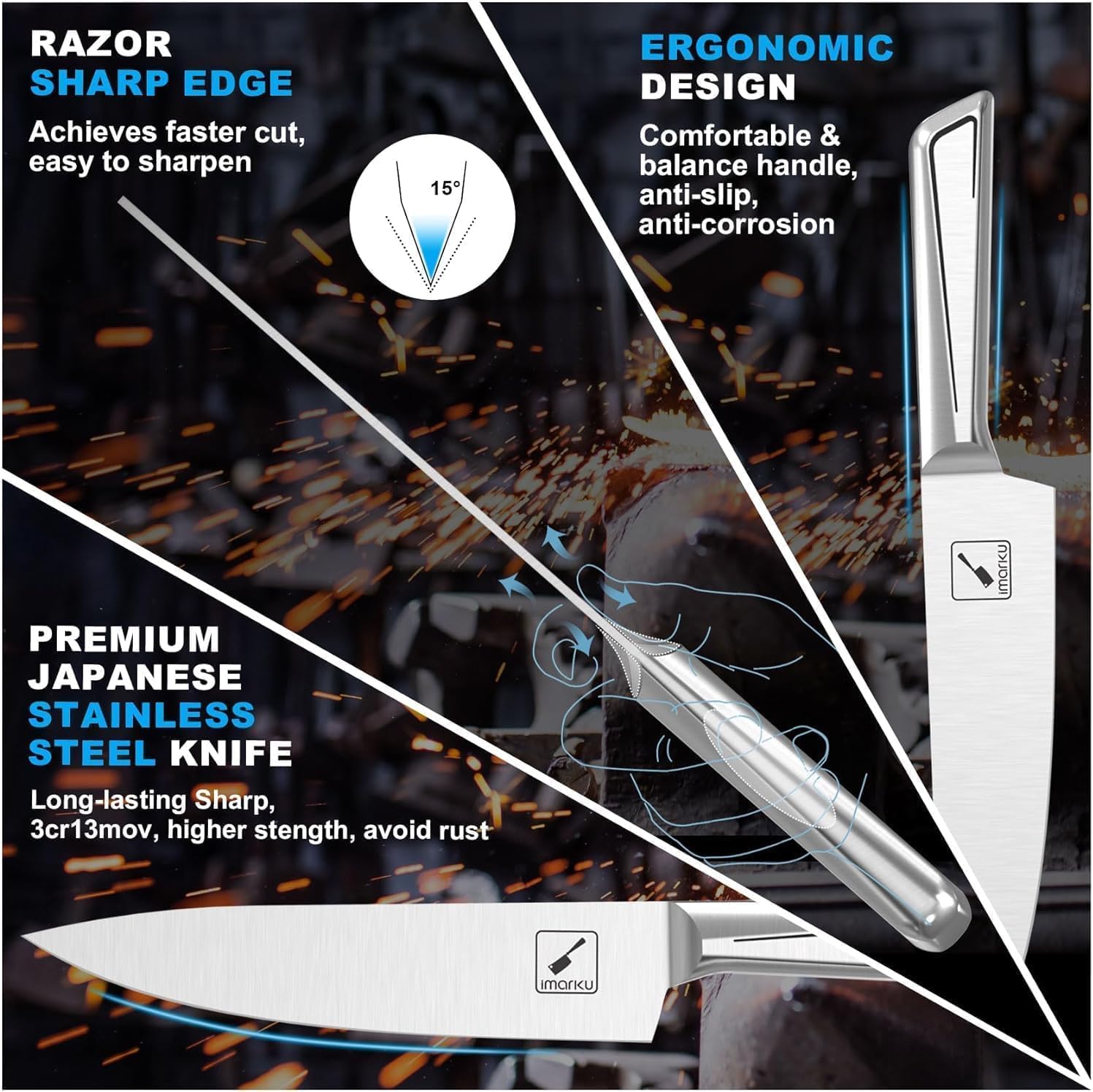 Premium Japanese Kitchen Knife Set with Block – The imarku G14 high-carbon stainless steel knife set delivers razor-sharp precision for effortless slicing, dicing, and chopping. Each blade is rust-resistant, dishwasher safe, and features a built-in sharpener in the hardwood block for easy maintenance. Ideal for chefs, beginners, or as gifts for women and men.