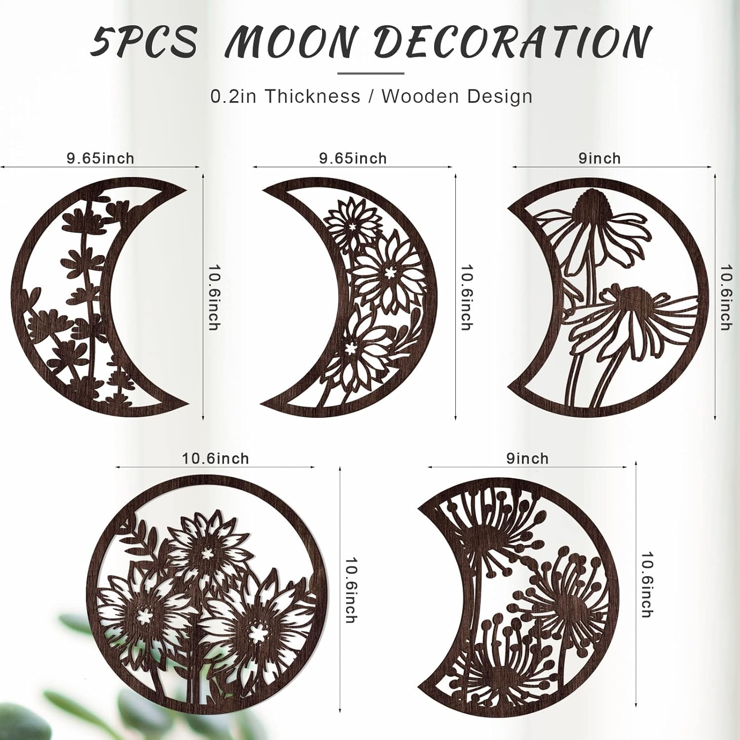 Jetec 5 Pcs Moon Phase Wall Hanging Decor Art Above Bed 10.6″ H Boho Moon Phase Wood Wall Pediment Ornament for Living Room Bedroom Home Decoration Room Apartment Bar(Brown)