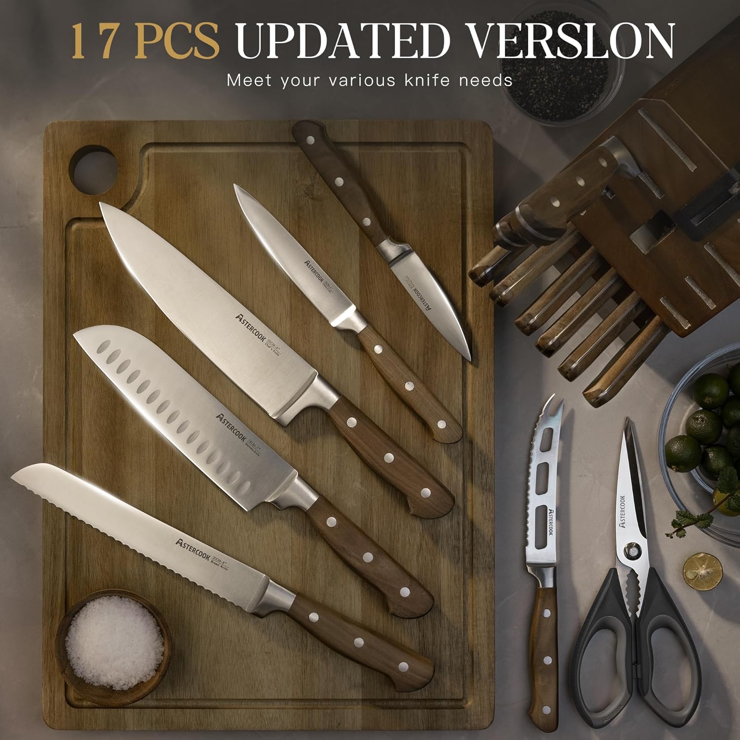 【Comprehensive 17-Pieces Knife Set with Block for Every Culinary Task】 This all-in-one collection includes: 8″ Chef Knife, 8″ Bread Knife, 8″ Slicing Knife, 7″ Santoku Knife, 6″ Boning Knife, 5″ Utility Knife, 5″ Cheese Knife, 3.5″ Paring Knife, 4.5″Steak Knife, and more—neatly housed in a rich Walnut Series knife set, ready to tackle every prep with flair.