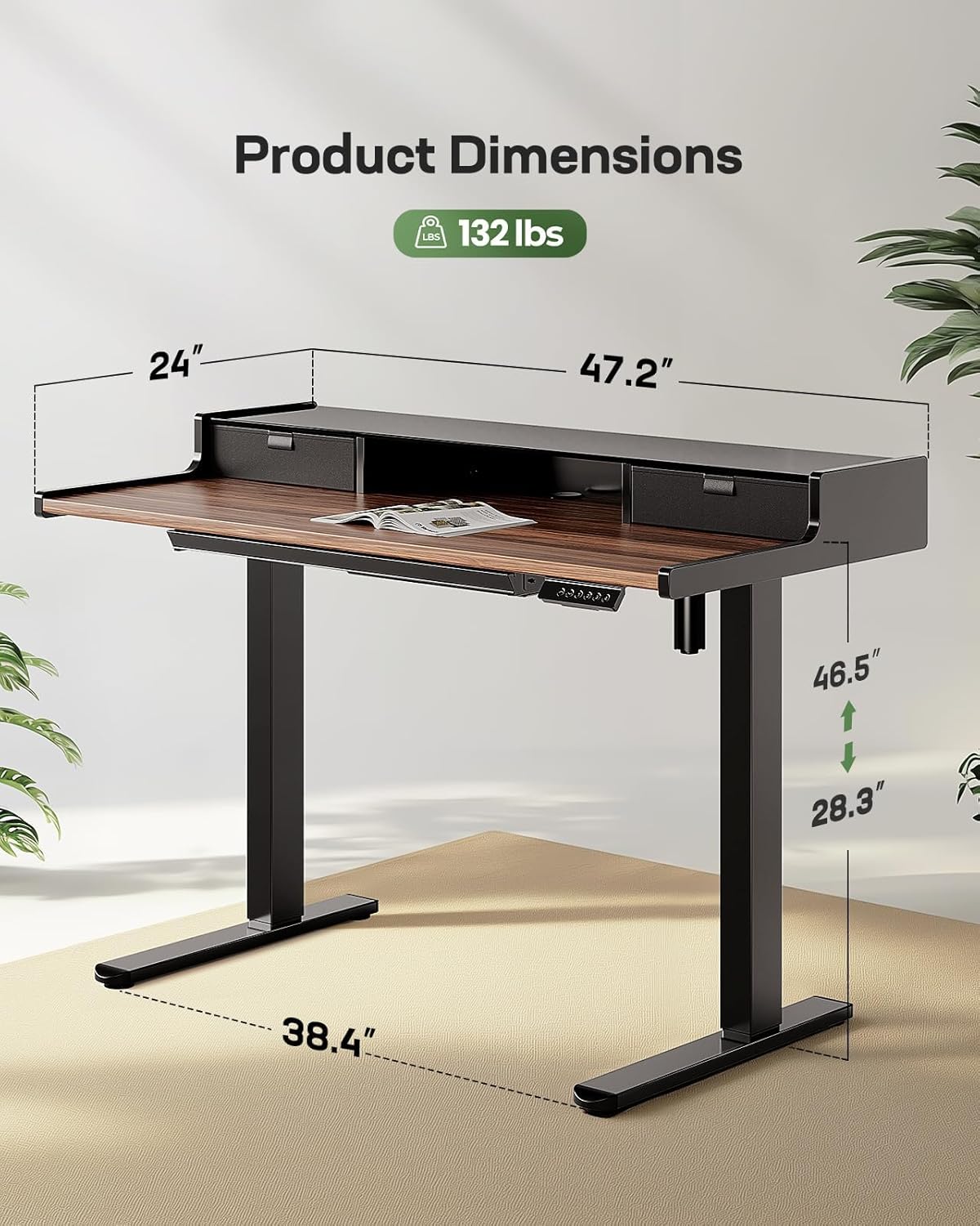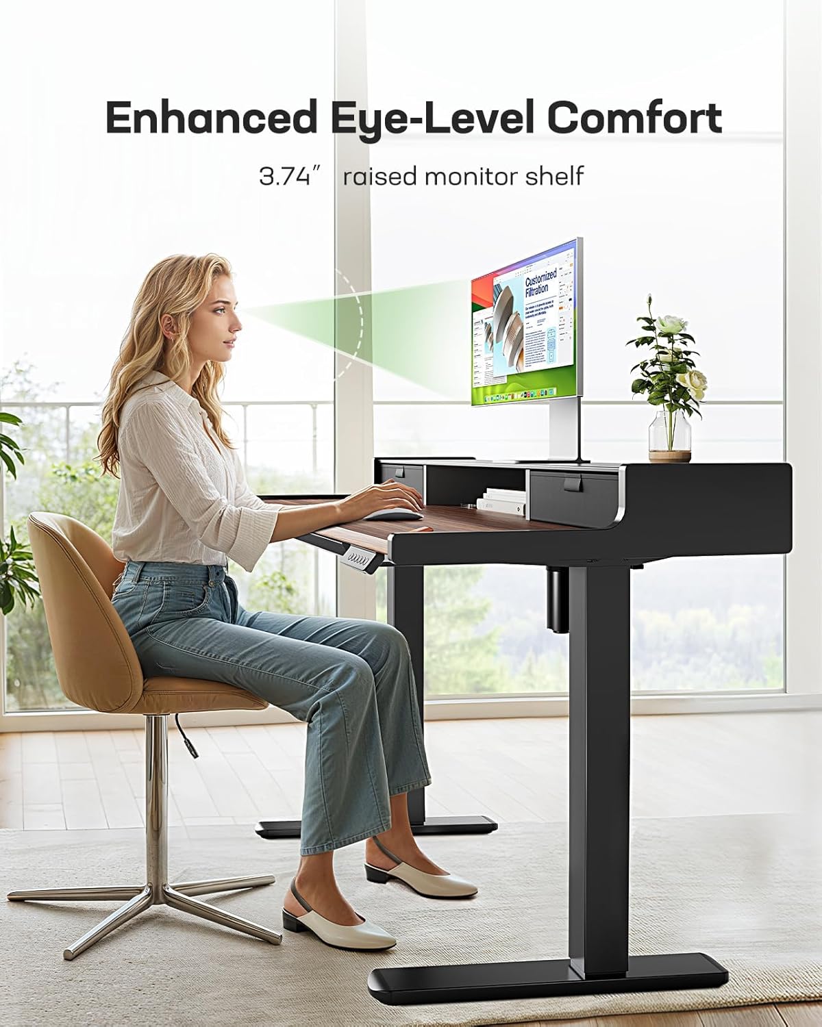 Marsail Electric Standing Desk with Drawers, 48 x 24 Inch Stand Up Desk with Glass Monitor Stand, Height Adjustable Desk with Drawers for Home & Office, 4 Preset Heights, Black Walnut