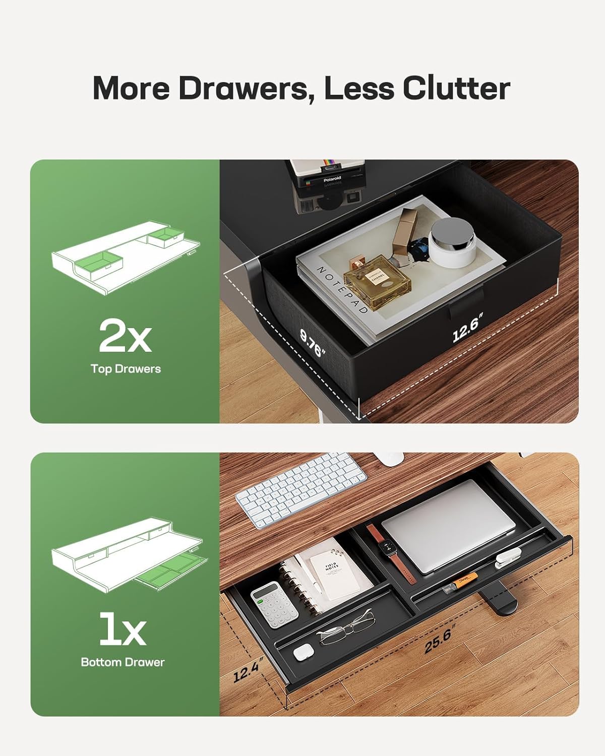 Smart and Stylish Storage: Keep your workspace clean and organized with our adjustable desk. The stangding desk with drawers is designed with two upper drawers and a lower 4-zone drawer that all offer ample storage space for office supplies, allowing you to maintain a neat and tidy work environment.