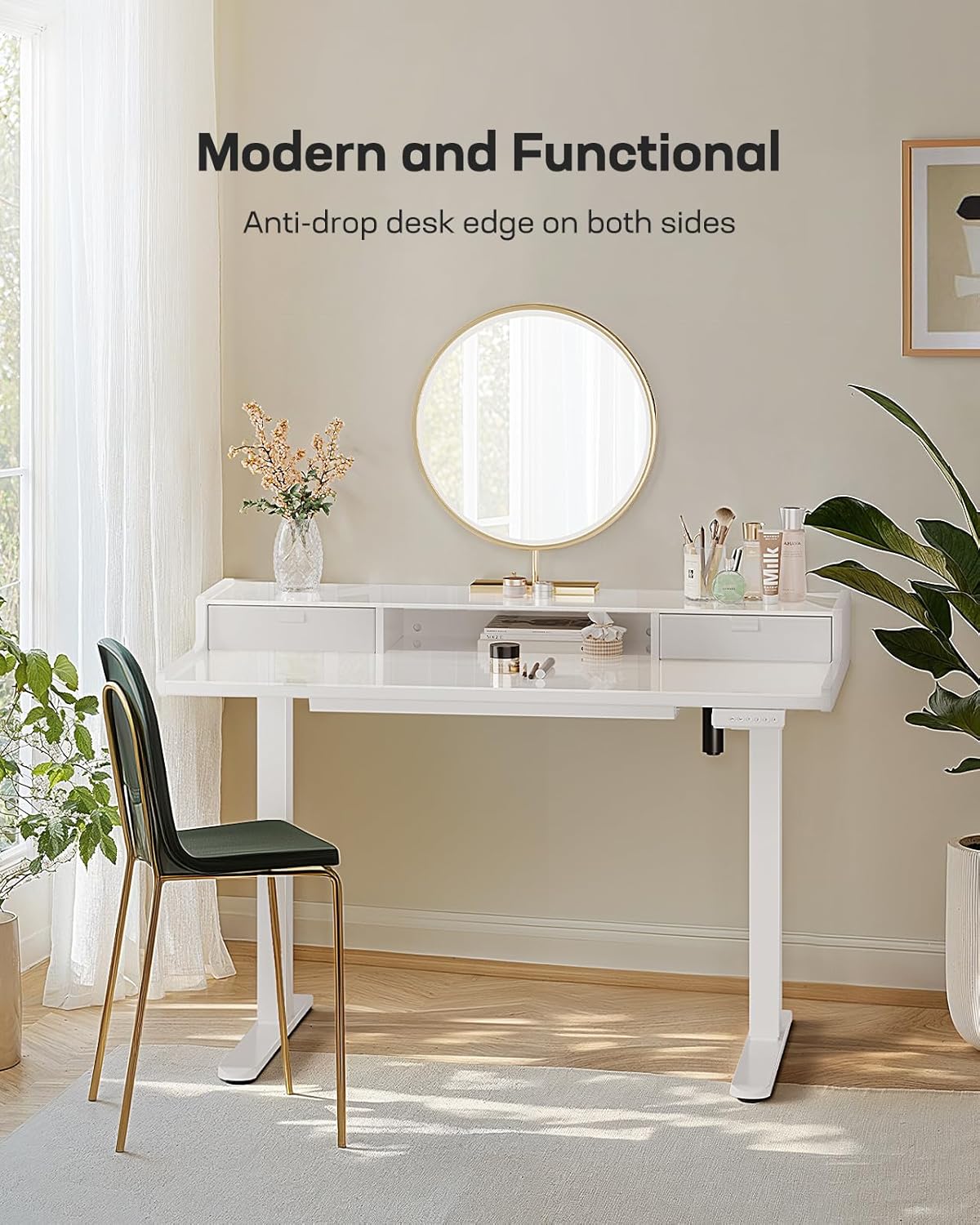Smart and Stylish Storage: Keep your workspace clean and organized with our adjustable desk. The glass desk with drawers is designed with two upper drawers and a lower 4-zone drawer that all offer ample storage space for office supplies, allowing you to maintain a neat and tidy work environment.