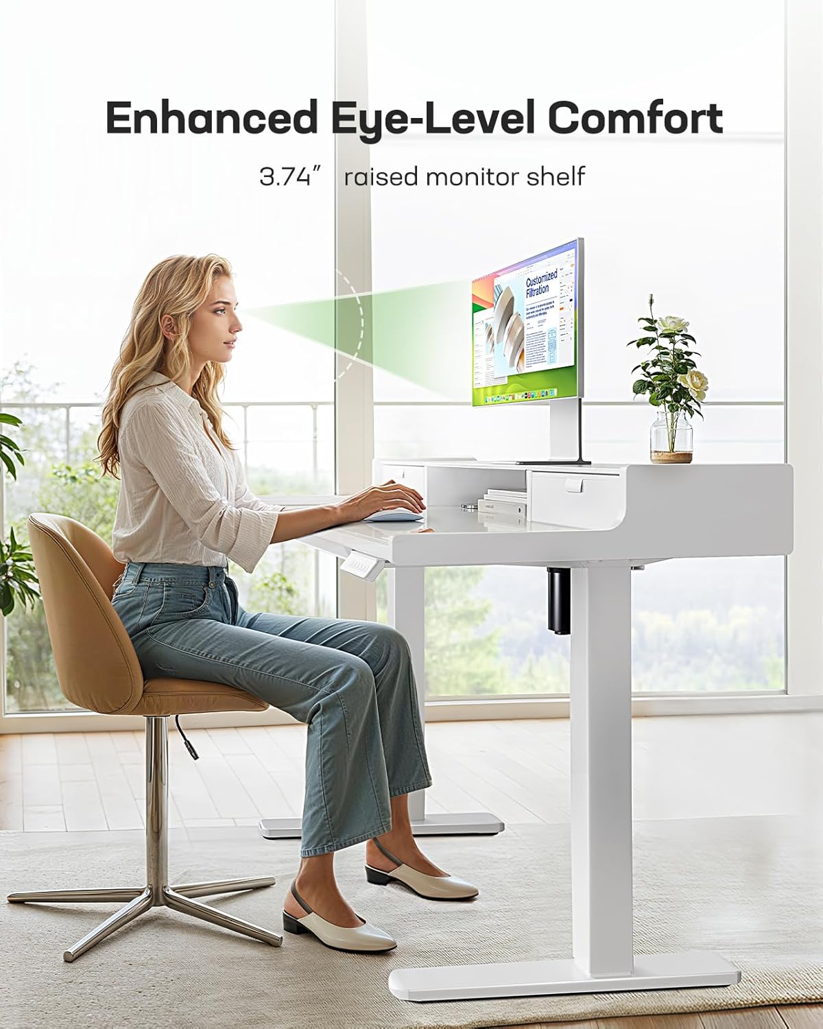 Improved Eye-Level Viewing: The standing desk with monitor stand helps to elevate your screen 5.2″ closer to eye level for less neck and eye strain. The raised top shelf raises your monitors higher than your keyboard and mouse to create more space underneath for an organized and efficient workspace.