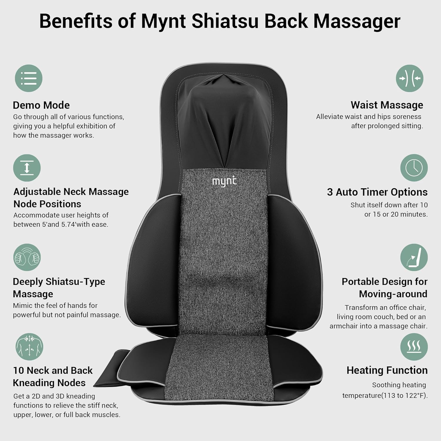 Mynt 2D & 3D Shiatsu Neck and Back Massager for Chair with 10 Deep Kneading Nodes, Back Massage with Heat, Portable Spot Massage Chair Pad (Black)