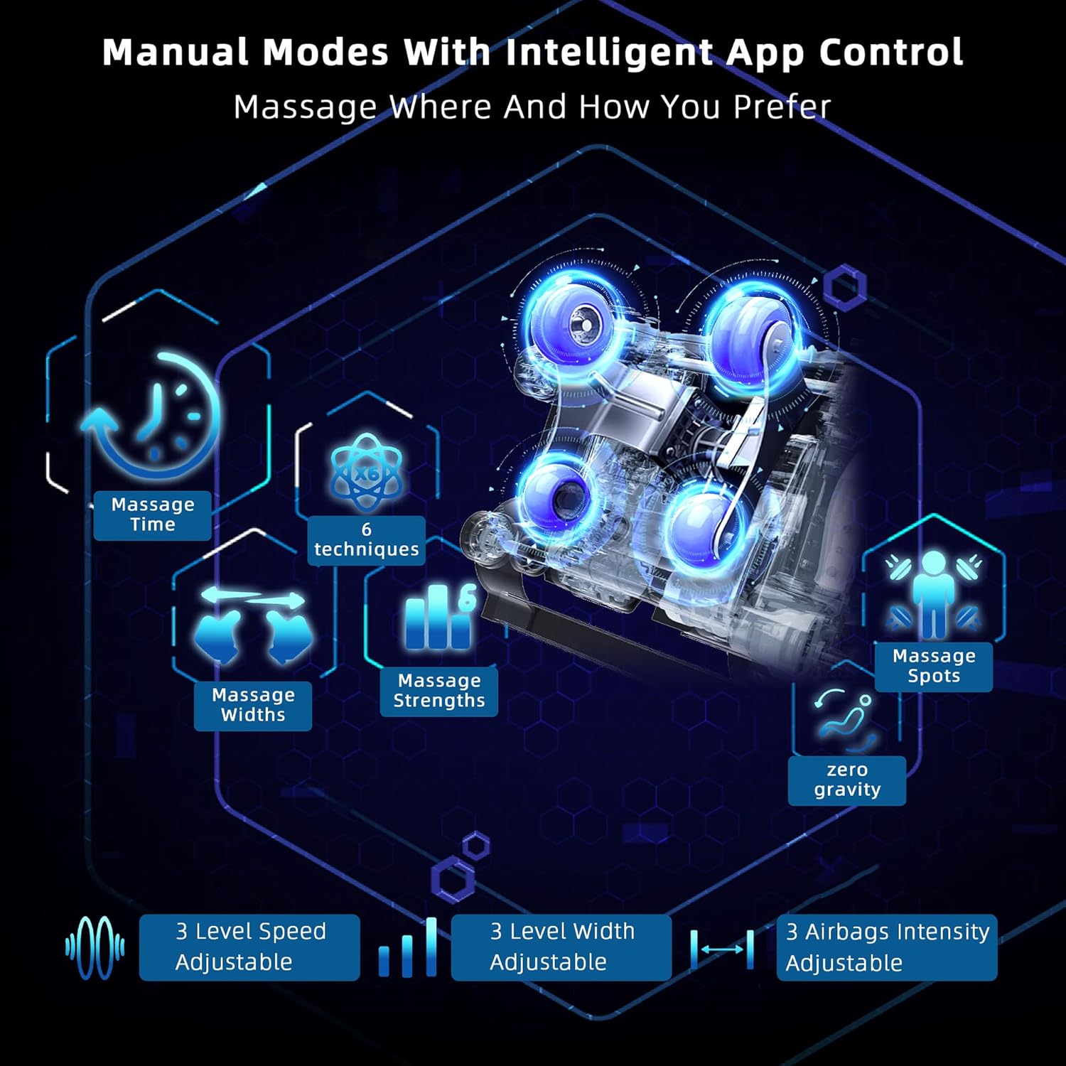 12 Auto Programs & Manual Options – Choose from Relax, Gentle, Neck & Shoulder, Spine Care, Full Airbag, Deep Tissue, Energy, Sleep, Office, Senior, Waist & Hip, and Vitality modes, or customize manually with multiple techniques, speeds, widths, and intensities to match your personal preferences.