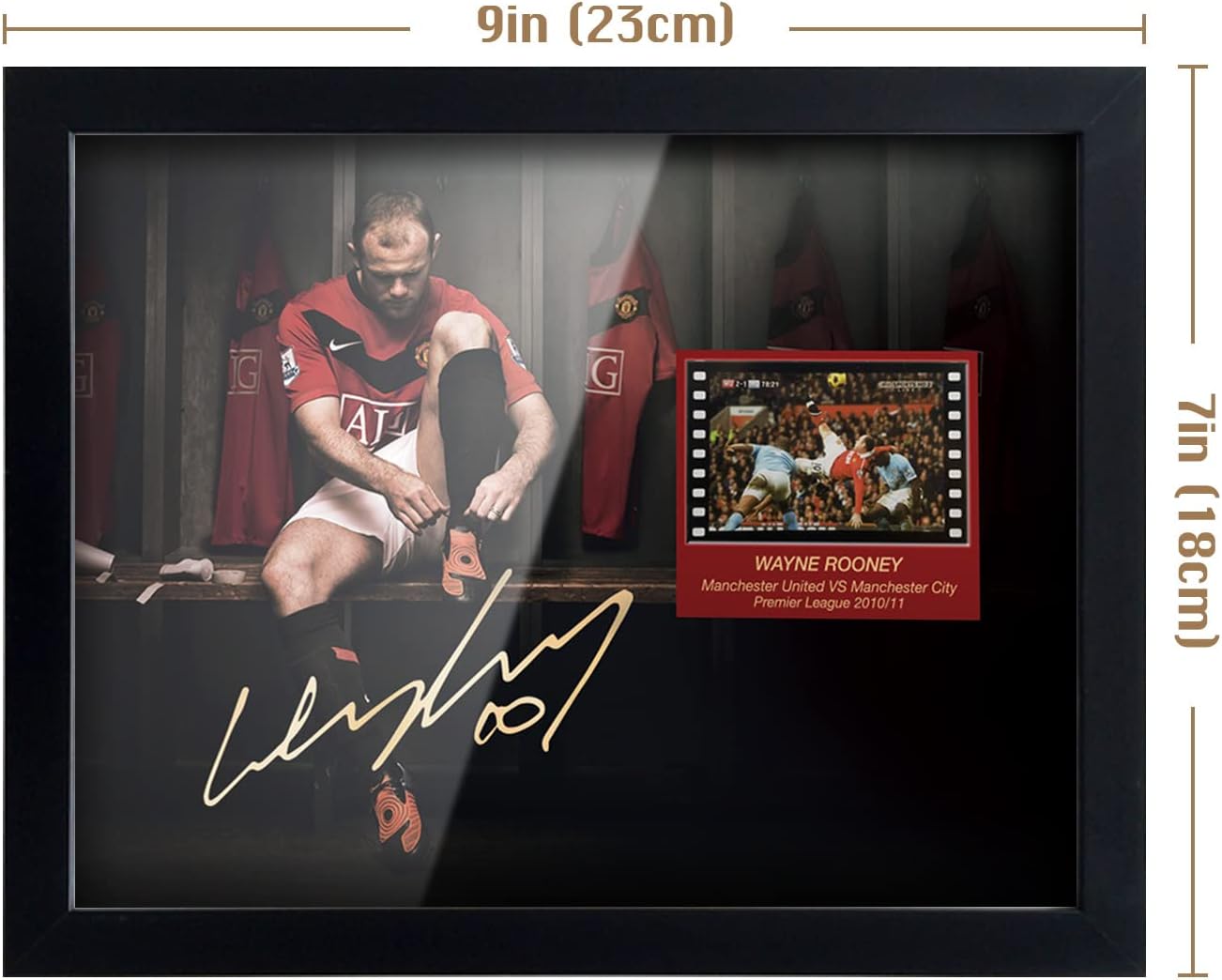 ORIMAMI committed to designing more high-quality collectible gifts and home office decor for huge soccer fans,suitable for any occasion;The receiver will love it! About Wayne Rooney: He is widely regarded as one of the leading football players of his generation;A talisman for Manchester United,since his transfer to them in 2004,Rooney is their star player and the first name on the team sheet.The emotional high of scoring the winner against Manchester City with that overhead bicycle kick to the crushing low of the thrashing City handed out at Old Trafford in the 2010-11 season. Film Cell Showing: one of the scenes from Premier League 2010/11 Manchester United vs Manchester City.The Pichture Signed:Our designs feature a digital reprint of the original autograph.They are printed,not hand signed originals. This black frame made of high-quality MDF wood,high transparent PMMA panel;HD printed picture more clear;Picture size:8×6 inches,Framed size:9x7x0.5 inches(23x18x1.2 cm).Framed type is desktop support. A great gift and a perfect addition to your home decor.Should you have any doubt please contact us before purchase,and will do all we can to resolve any problems.If you are not satisfied with our products,and we provide up to 30 days of exchange or refund services.